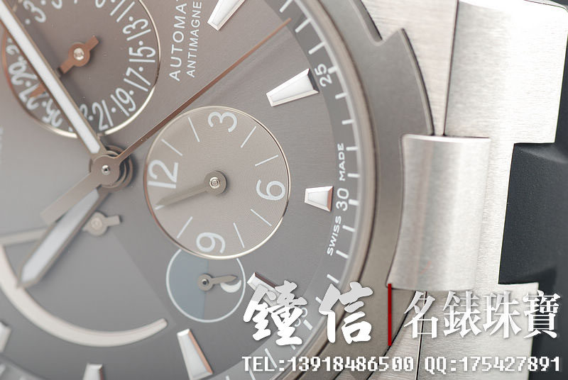 表壳 精钢,钛金属表圈,旋入式表冠,旋入式按钮,内置抗磁功能,高达25,000 A/m