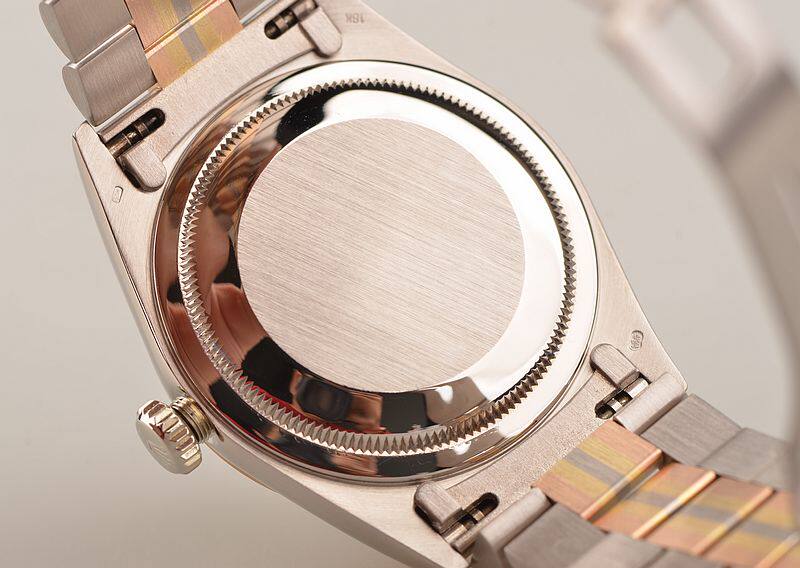 18K黄金,白金,玫瑰金三色金无缝融合而成的表壳及链带,蚝式专利折叠表扣。女皇头印记。18K黄金三角坑纹表圈。蓝宝石水晶镜面,立体香槟金色面盘,10颗天然美钻刻度,其中6,9刻度为条钻,星期日历显示功能。口径36MM*13.3MM,旋入式防水锁把,防水100M。