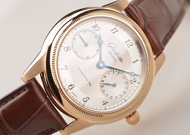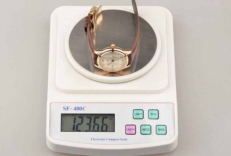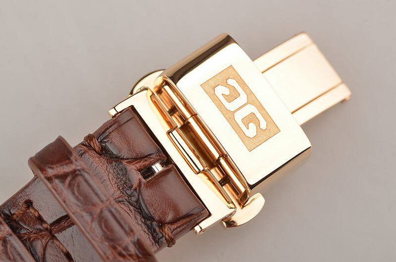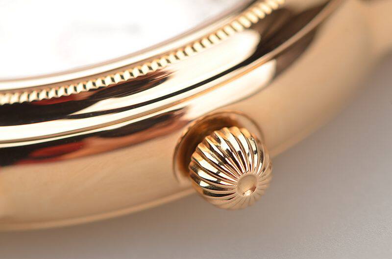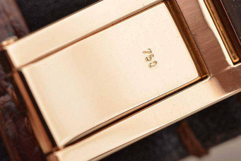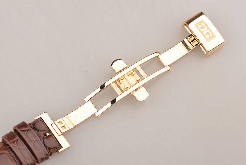 18K玫瑰金表壳及折叠式表扣,圣伯纳狗头印记。后配全新棕色路易斯安娜短吻鳄鱼皮表带。蓝宝石水晶镜面及底盖,立体银白色表盘,阿拉伯数字刻度,蓝钢指针,9点位独立小秒针,3点位指针式日历显示功能。口径39MM*12MM,防水50M。