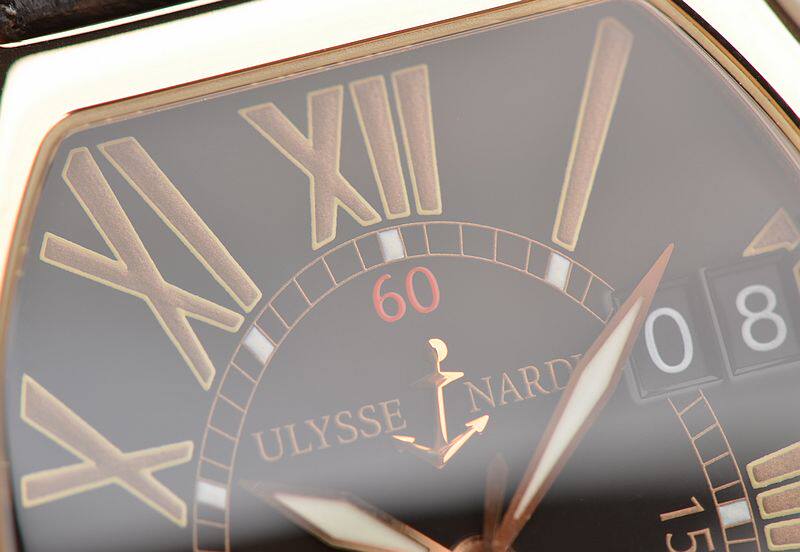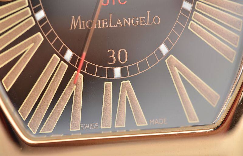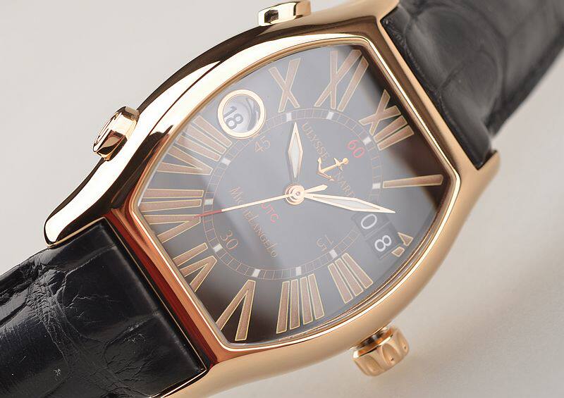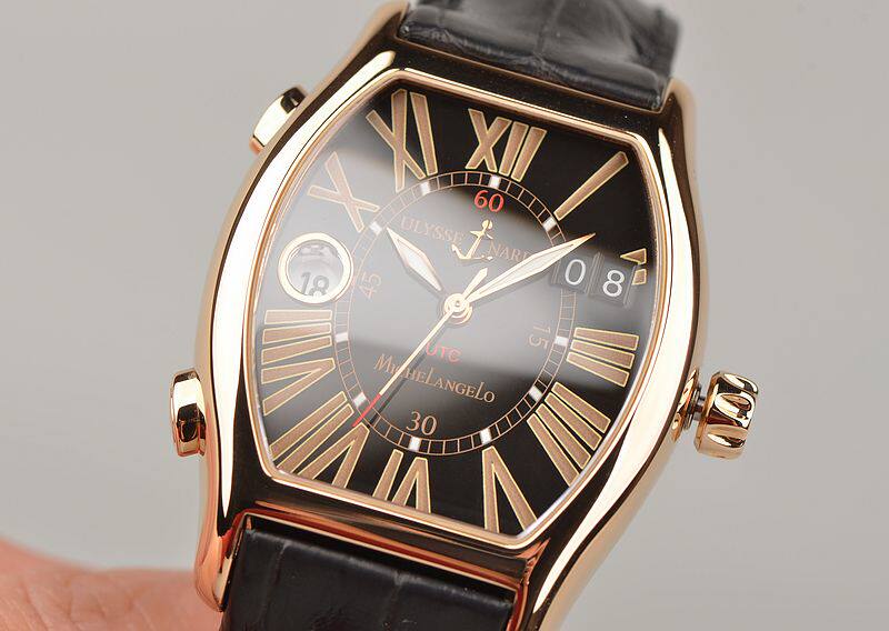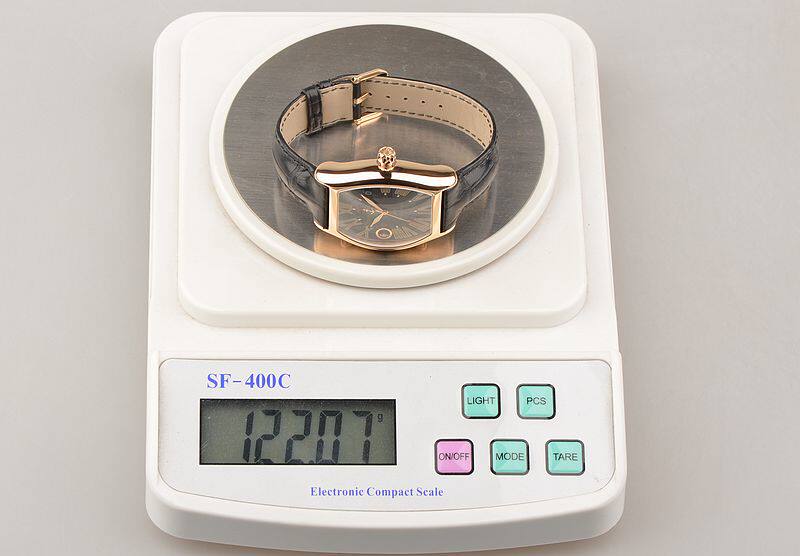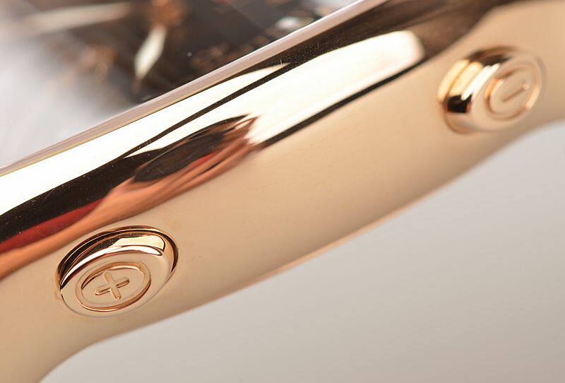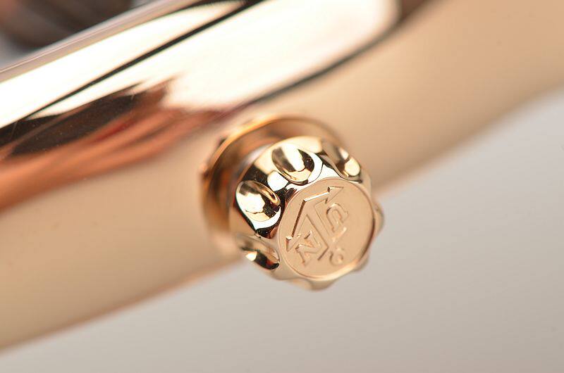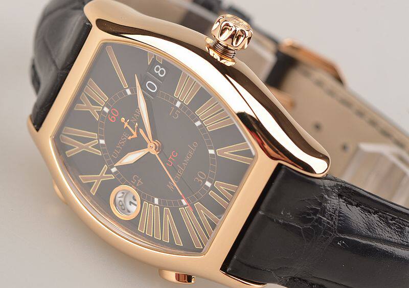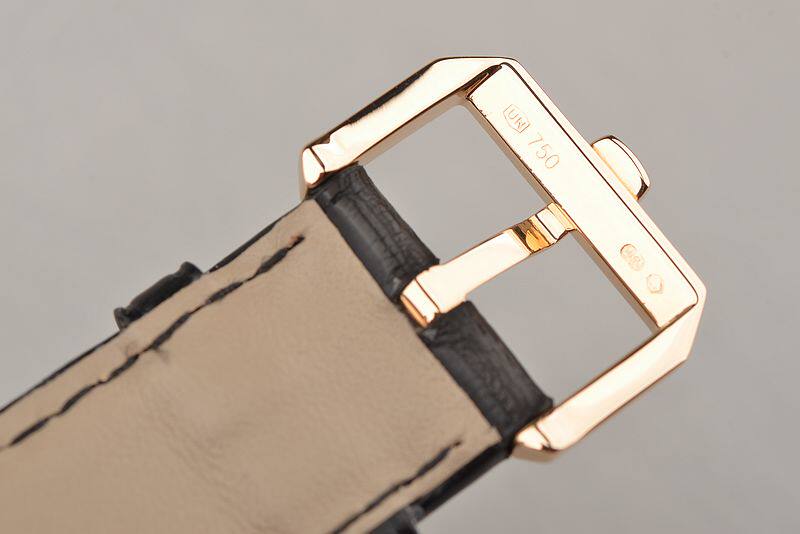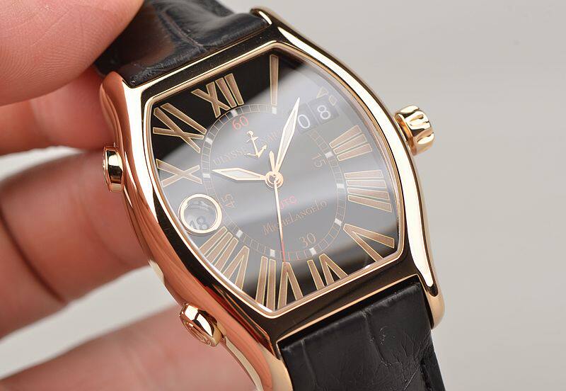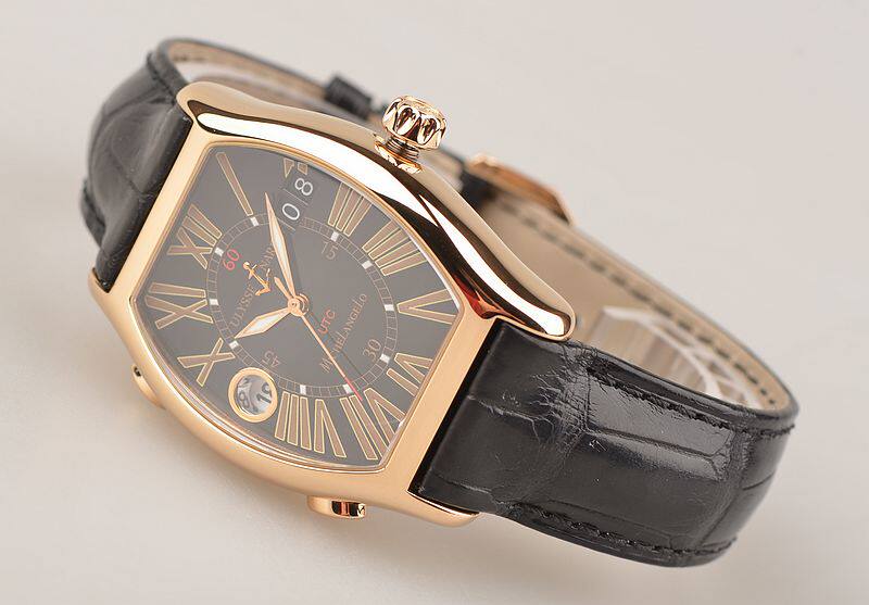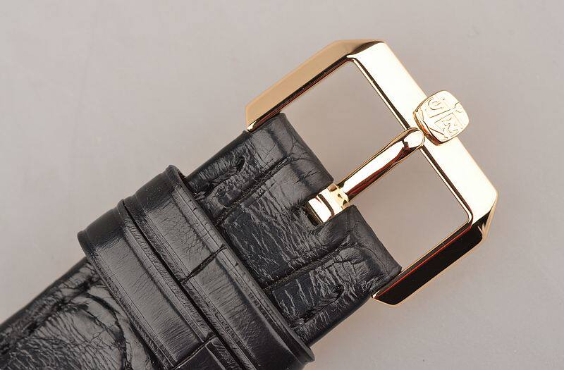 18K玫瑰金表壳及表扣,圣伯纳狗头印记。后配全新黑色鳄鱼皮表带。蓝宝石水晶镜面,立体黑色表盘,玫瑰金夜光刻度及指针,GMT第二时区功能(表壳侧面按键快速调整),2点位大日历视窗功能。旋入式表冠。口径47.6MM*35MM*12MM,相当于圆表40MM左右大小,防水100M。
