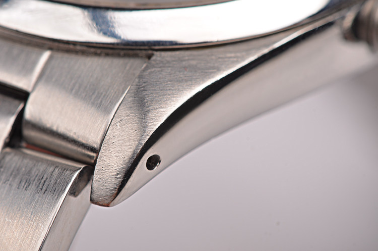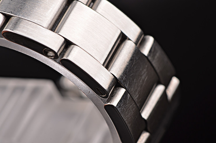 精钢表壳及链带,可微调折叠式表扣。亚克力镜面,立体银白色表盘,夜光刻度及时分针,3点位放大镜日历显示功能,旋入式防水表冠。口径34MM*13.1MM。