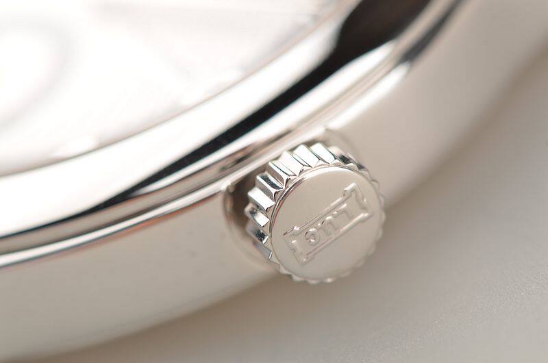 18K白金表壳及表扣,圣伯纳狗头印记。后配黑色鳄鱼皮表带成色较新。蓝宝石水晶镜面及底盖,立体黑白相拼色表盘,阿拉伯数字刻度,瑞士天文台认证标识,12点位指针式八天动能储备显示,6点位指针式日历及独立小秒针。口径39.5MM*9.3MM。防水30M。
