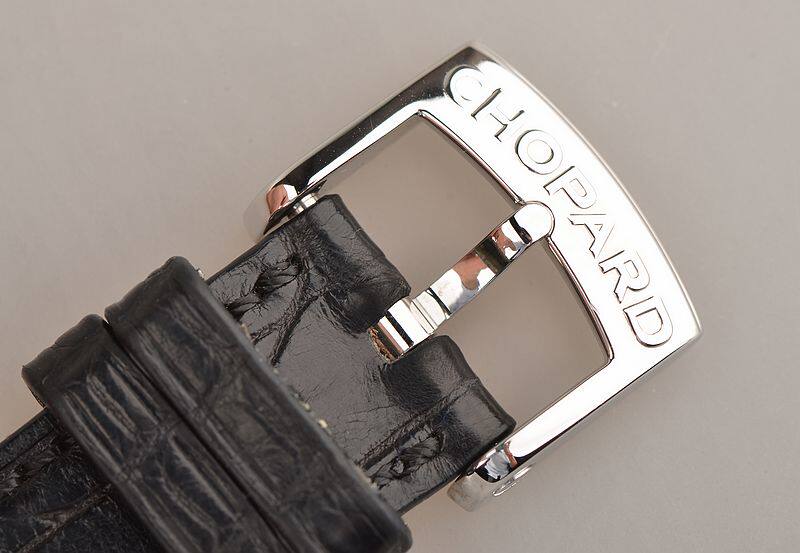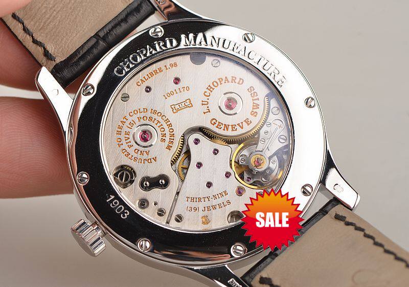 萧邦自产的L.U.C. 1.98型机芯,高端系列机芯,手上链,极其精致日内瓦条纹打磨,倒角抛光修饰。由240个零件组成,5方位校正,鹅颈微调,机芯独立签名,39钻,摆频28800,双发条盒,动力储备约216小时,标注八天。走时状态极嘉。