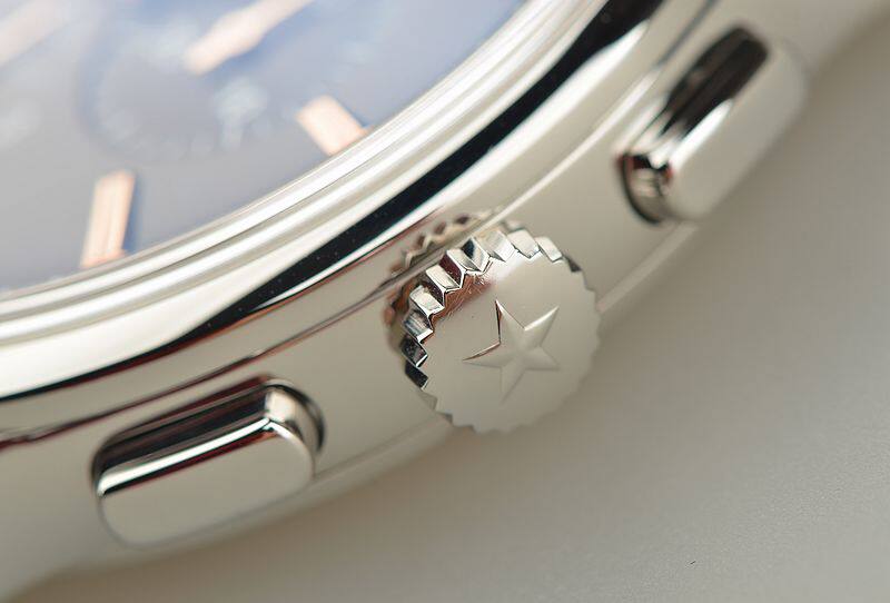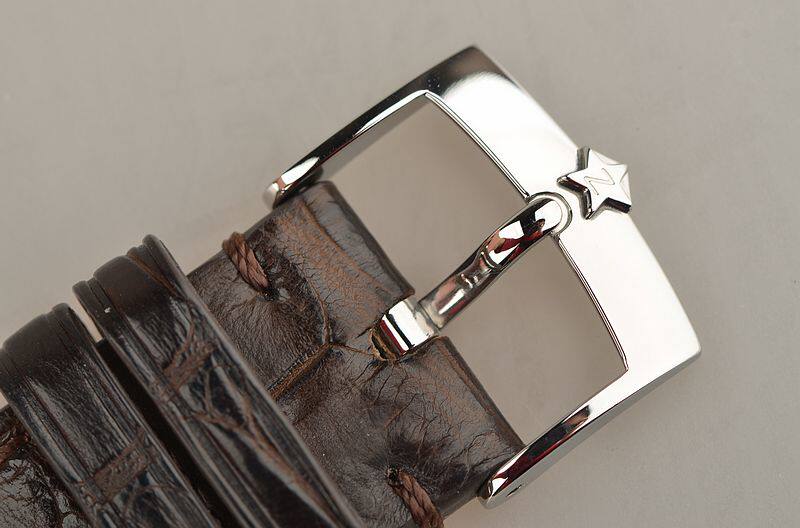 精钢表壳及表扣,原厂深棕色鳄鱼皮表带成色极新。蓝宝石水晶镜面及底盖,立体深棕色计时表盘,金质刻度及指针,9点位独立小秒针,6点位12小时计时圈,3点位30分钟计时圈,6点位日历显示窗口,36000VPH高频机芯标识。口径42MM*11.8MM。防水50M。