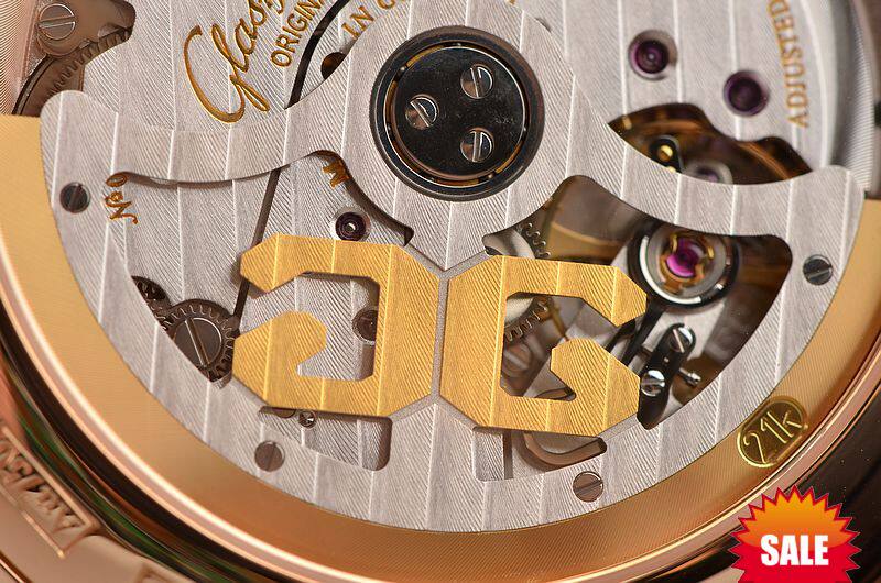 GO自产CAL.100-02型机芯,自动机械,标准德式3/4大夹板机芯,极其精致人手条纹打磨,倒角抛光修饰。59钻,摆频28800,鹅颈微调器,机芯独立签署,21K镂空黄金自动转陀配重。动力储存约55小时。走时状态极嘉。