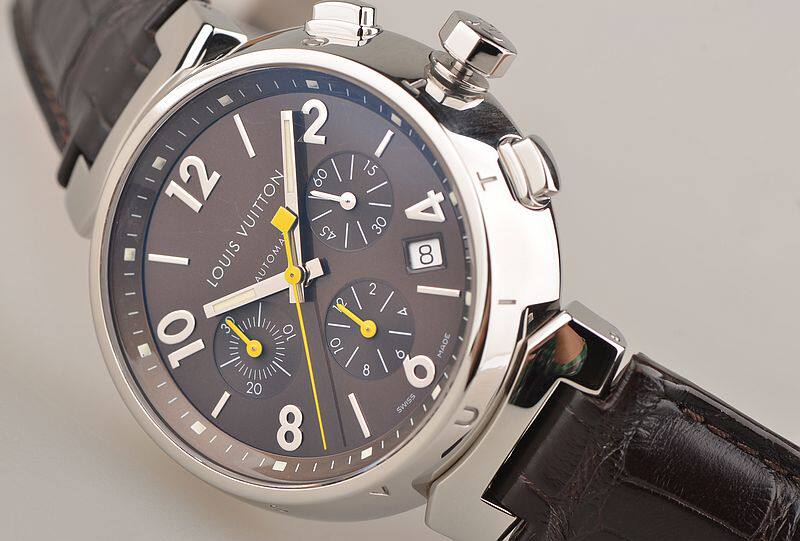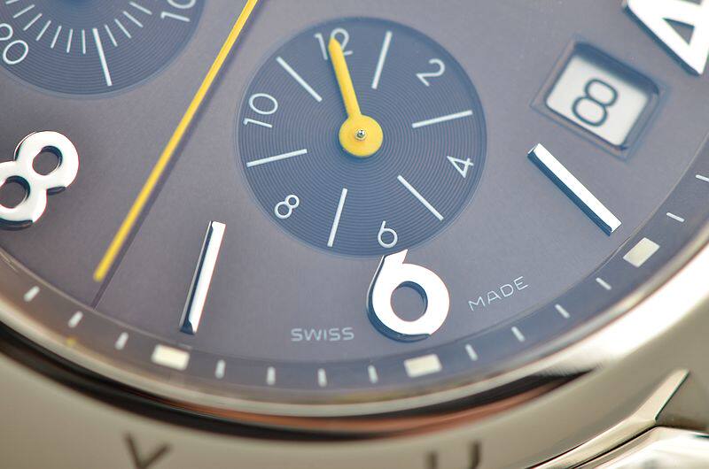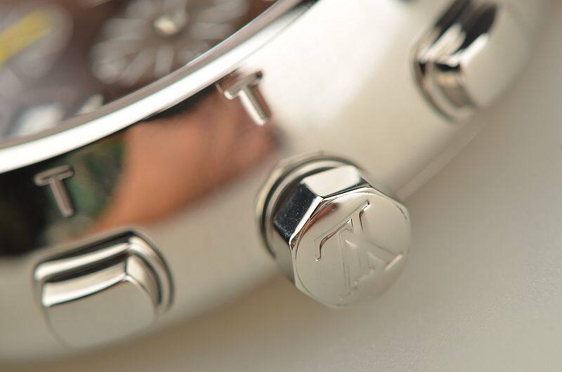 精钢表壳及表扣,原厂深棕色鳄鱼皮表带成色很新。蓝宝石水晶镜面,立体棕色计时表盘,夜光刻度及时分针。9点位30分钟计时,6点位12小时计时,3点位独立小秒针,4至5点位间日历显示功能。口径41MM*13.2MM。防水100M。