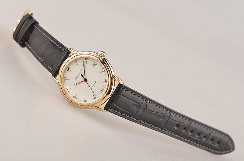 18K黄金表壳及表扣,女皇头印记,后配全新黑色鳄鱼皮表带。蓝宝石水晶镜面,立体白色表盘,黄金条钉刻度及时分针,蓝钢长秒针,3点位日历显示窗口。口径34.5MM*7MM,按现在的戴表习惯,男女合用。防水30M。