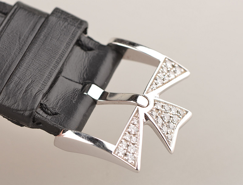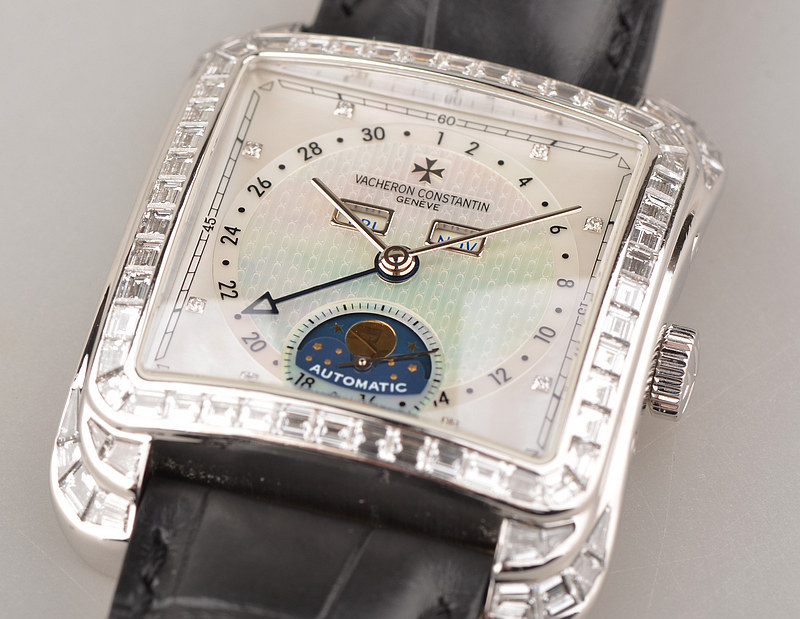 18K白金表壳及表扣,圣伯纳狗头印记。表壳原厂原镶72颗长条T钻,约4.52克拉。表扣亦镶满钻。蓝宝石水晶镜面,立体珍珠贝母面盘,钻石时标,白金指针,年历,月相功能,蓝钢日历指针。口径43MM*35MM*11MM,相当于圆表41MM左右大小,防水30M。