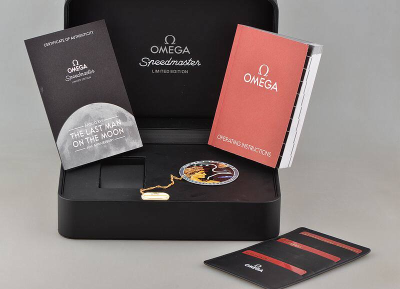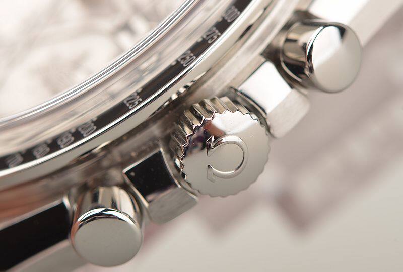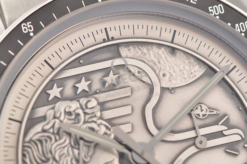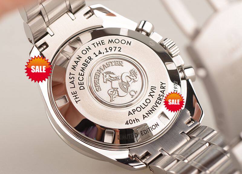 精钢表壳及链带,折叠式表扣。蓝宝石水晶镜面,立体925银阿波罗17号徽章浮雕表盘,夜光时分针,测速表圈。计时码表功能。口径42MM*14.8MM,防水50M。