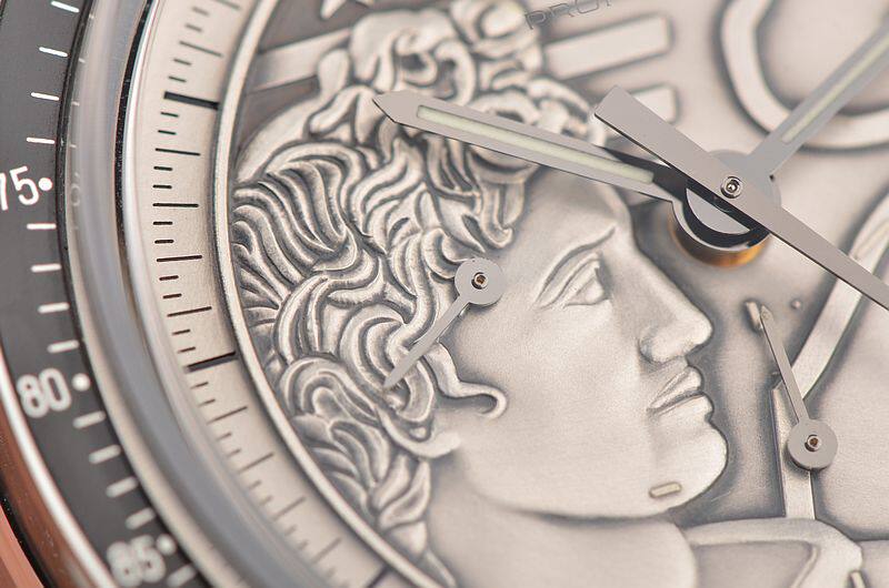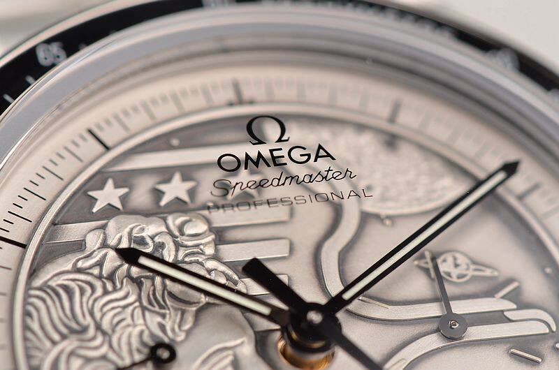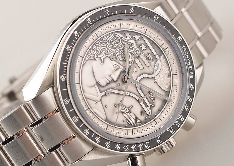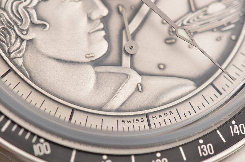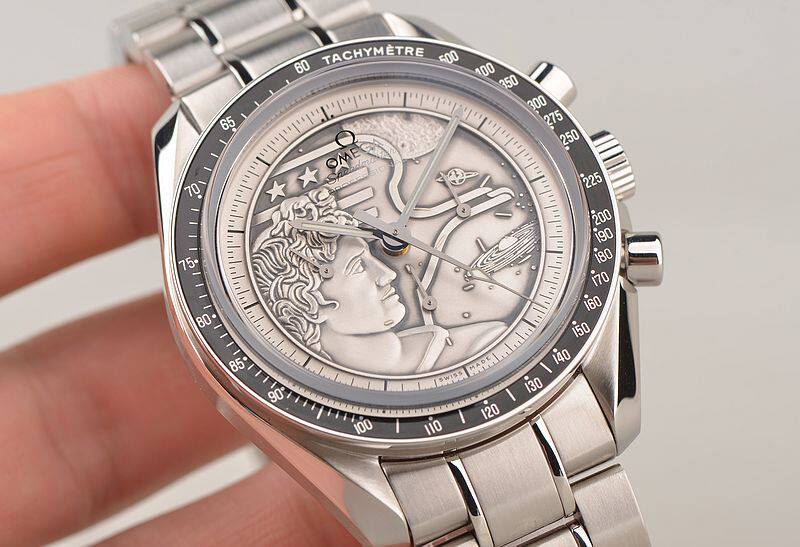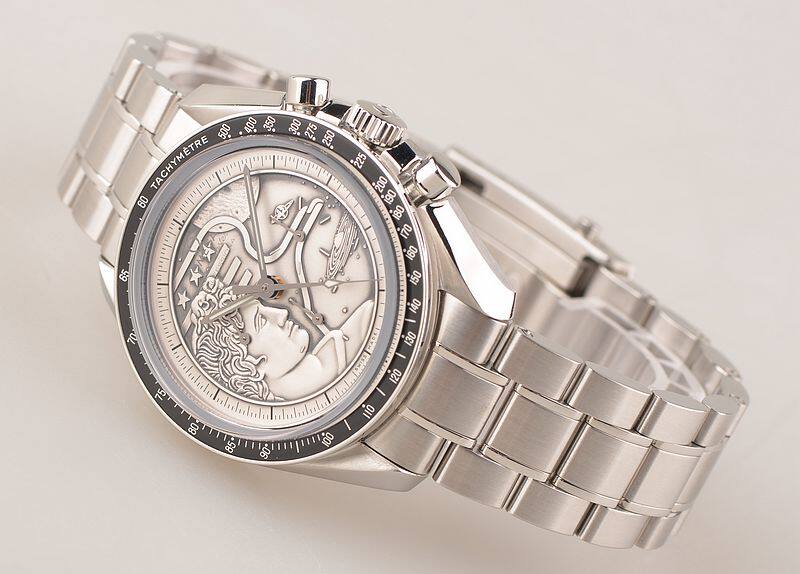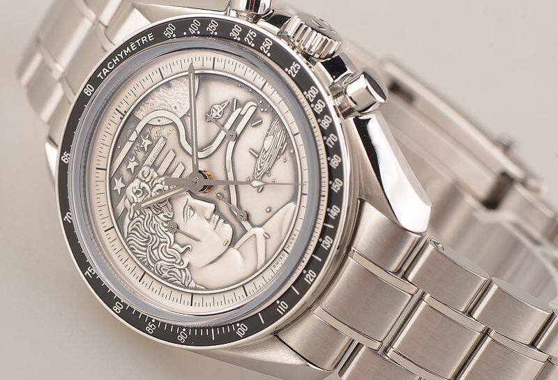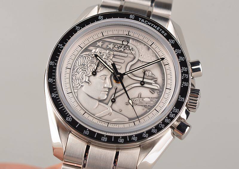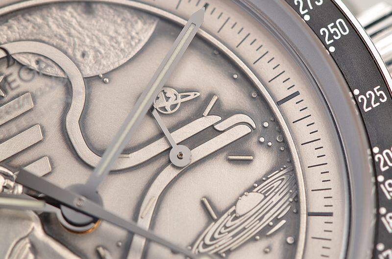 此限量版超霸“阿波罗17号”月球表用于纪念1972年12月最后一次登月任务40周年纪念。腕表的925银质表盘饰有与阿波罗17号徽章相同的浮雕设计。小秒针表盘、30分钟计时小表盘、12小时计时小表盘及中央计时指针为表盘倍添姿彩。