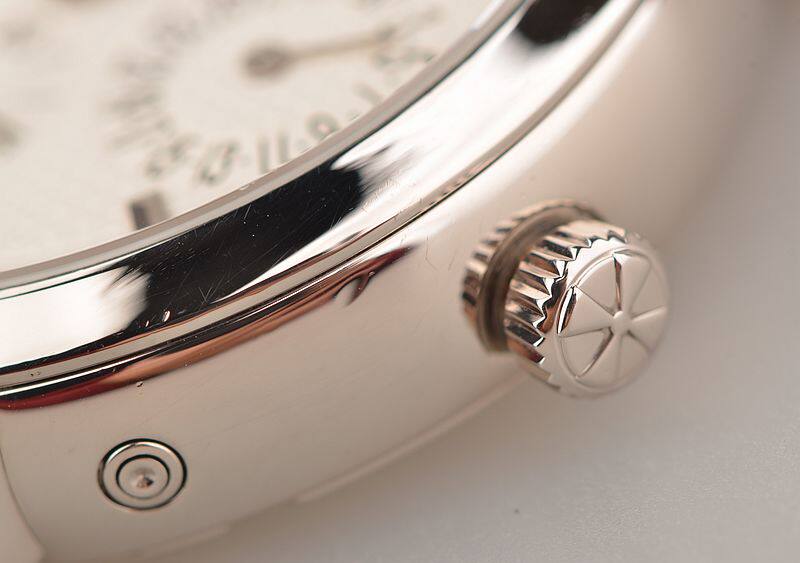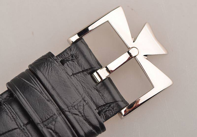 18K白金表壳及表扣,圣伯纳狗头印记。后配全新黑色鳄鱼皮表带。蓝宝石水晶镜面,立体白色表盘,白金刻度及指针,10点位指针式动能储备显示功能,6点位独立小秒针,3点位指针式日历功能。口径38MM*9.85MM,防水30M。