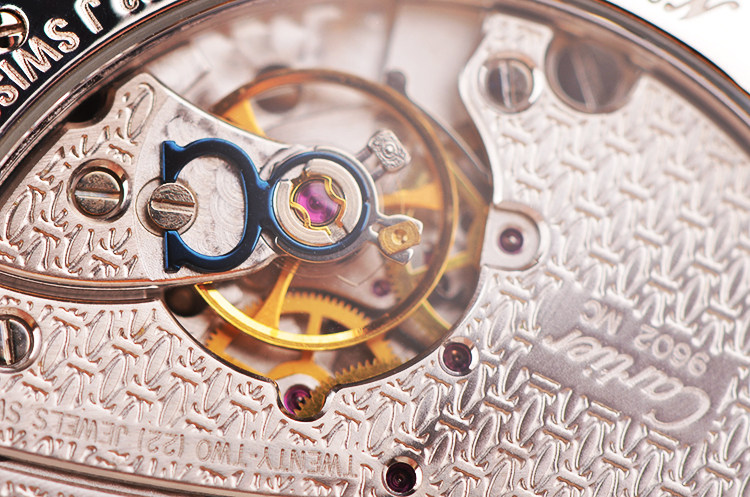 卡地亚巴黎工坊顶级CAL.9602MC型机芯,手上链,大夹板人手雕刻品牌LOGO,倒角抛光修饰,22钻,摆频28800,走时状态极嘉。