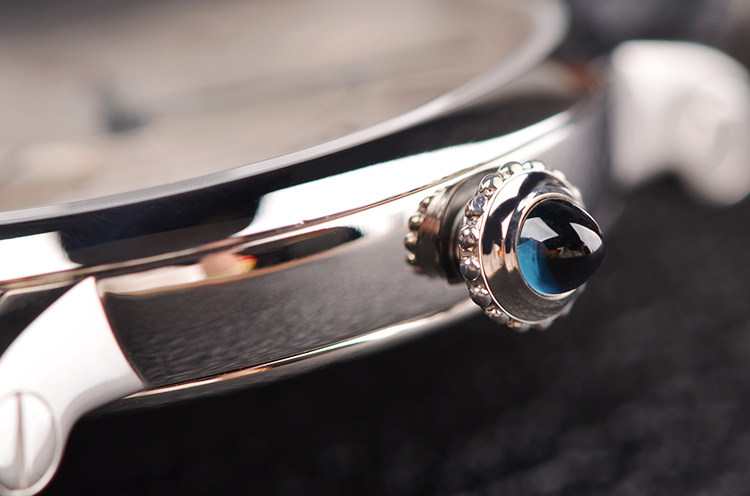 18K白金表壳及折叠式表扣,圣伯纳狗头印记。原厂黑色鳄鱼皮表带成色极新。蓝宝石水晶镜面及底盖,立体银白色太阳纹表盘,黑色罗马数字刻度,蓝钢指针,小三针设计,6点位独立小秒针,12点位大日历视窗。蓝宝石表冠。口径35MM*9.8MM,中性尺寸,男女合用。防水30M。