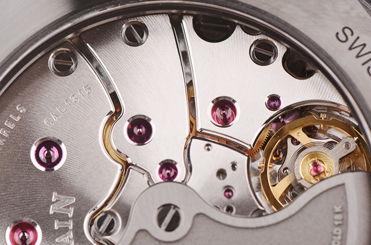 JB自产CAL.1315型机芯,自动机械,极其精致日内瓦条纹打磨,倒角抛光修饰。由227个零件组成,35钻,摆频28800,6方位校正机芯,3发条盒,动力储存约120小时,五天链长动力机芯。18K金自动摆陀,走时状态极嘉。
