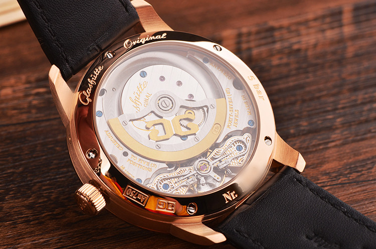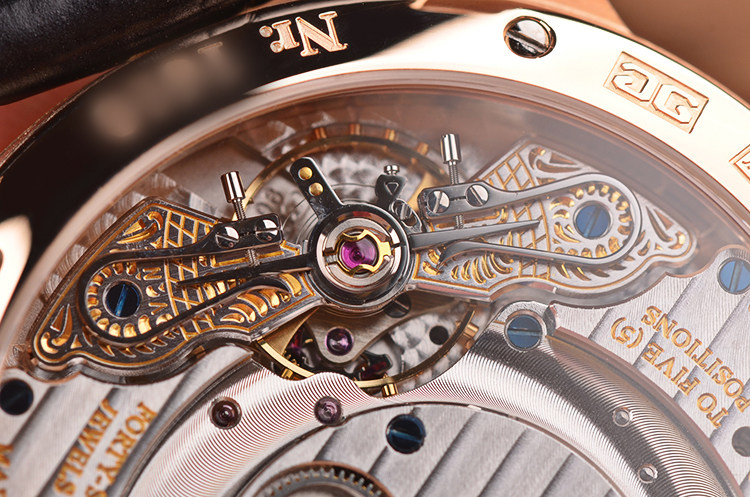 GO自产的CAL.90-02型机芯,自动机械,极其精致人手条纹打磨,倒角抛光修饰,德式3/4大甲板机芯,双鹅颈微调,21K黄金镂空自动陀配重,47钻,摆品28800,5方位校正,机芯有独立签署。动力储存约42小时。走时状态极嘉。