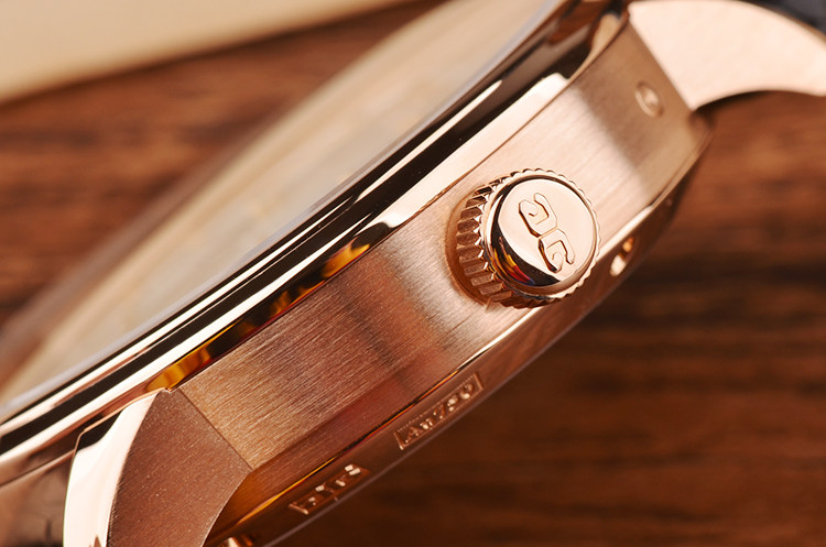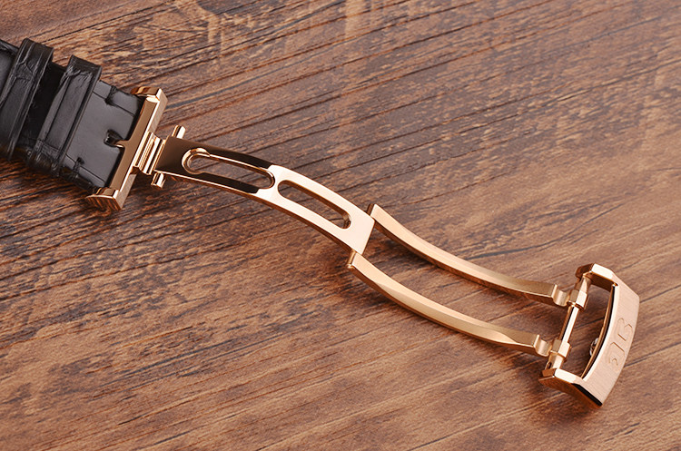 18K玫瑰金表壳及折叠式表扣,圣伯纳狗头印记,后配全新黑色路易斯安那短吻鳄鱼皮表带。蓝宝石水晶镜面及底盖,立体银白色偏心镀钌表盘,金质指针及刻度,时分针部分镶有夜光材质(Super-LumiNova),大日历,月相功能。口径40MM*12.7MM。防水50M。