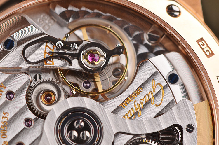 GO自产CAL.100-04型机芯,自动机械,极其精致人手条纹打磨,倒角抛光修饰,标准德式3/4型大夹板机芯,鹅颈微调,21K黄金镂空自动转陀,55钻,6方位校正,摆频28800,动力储存约55小时,走时状态极嘉。