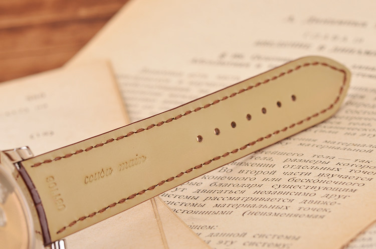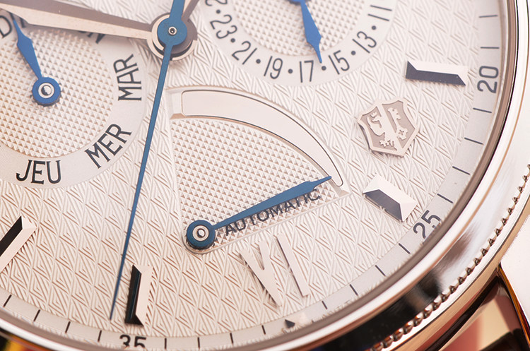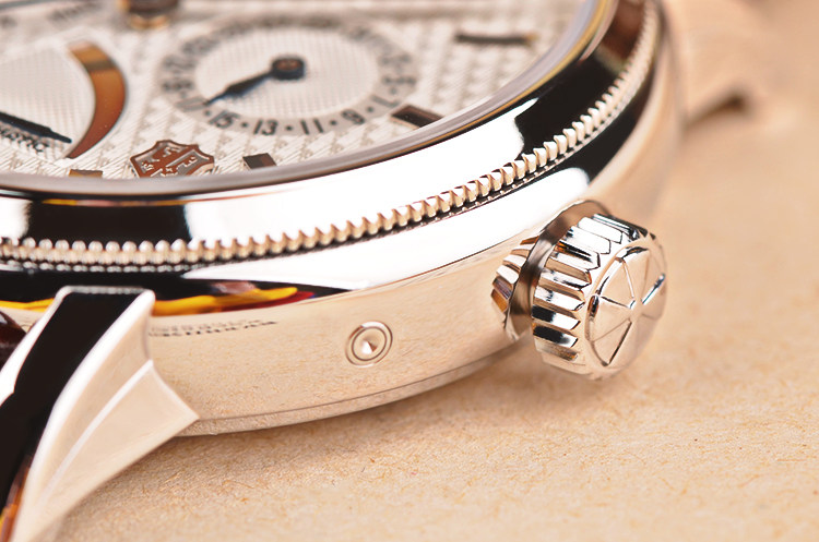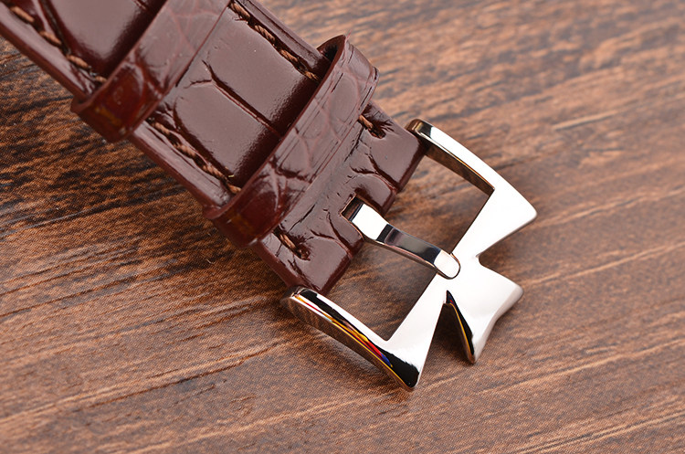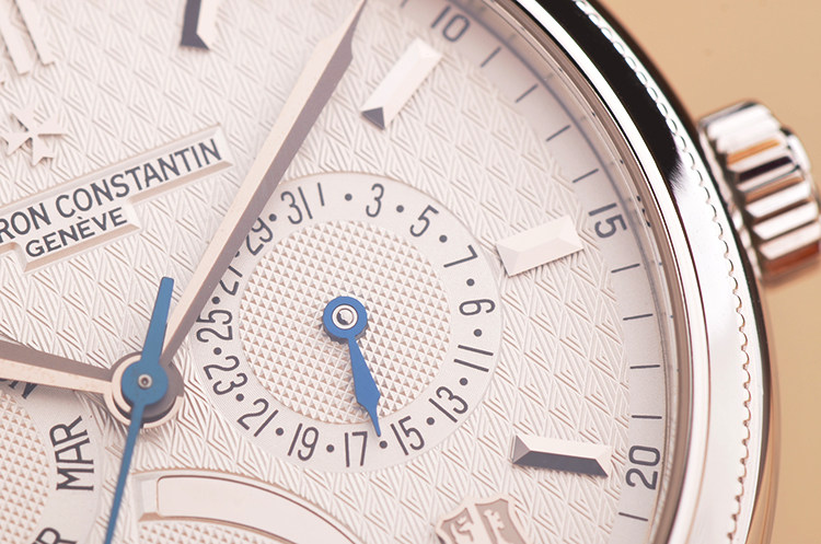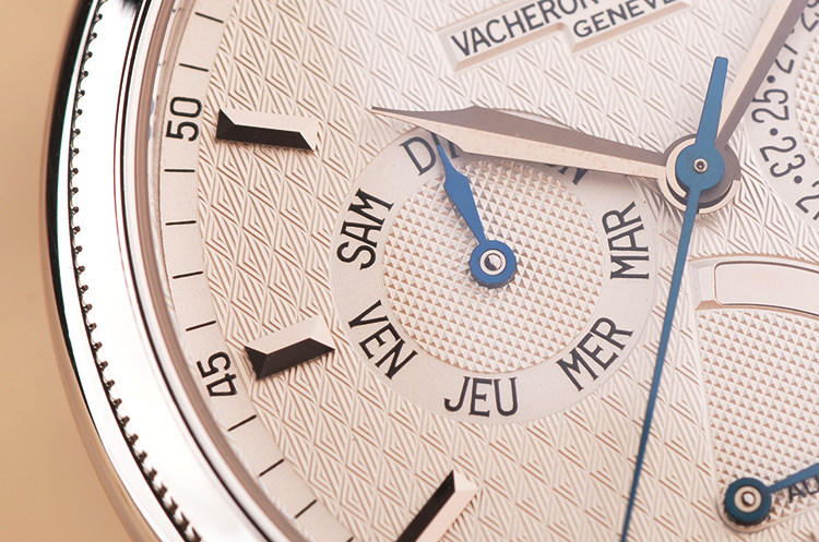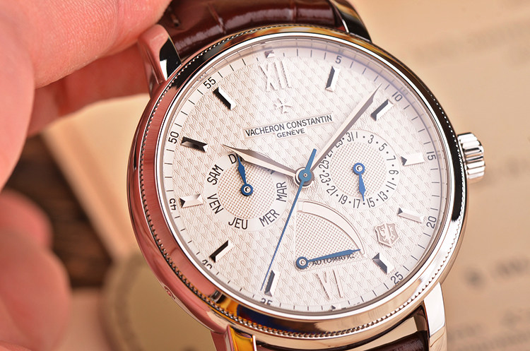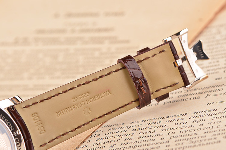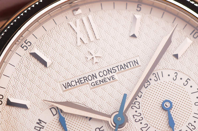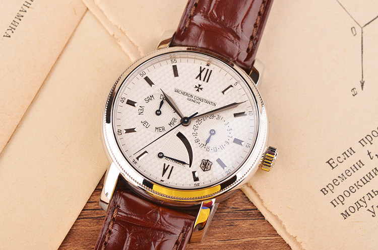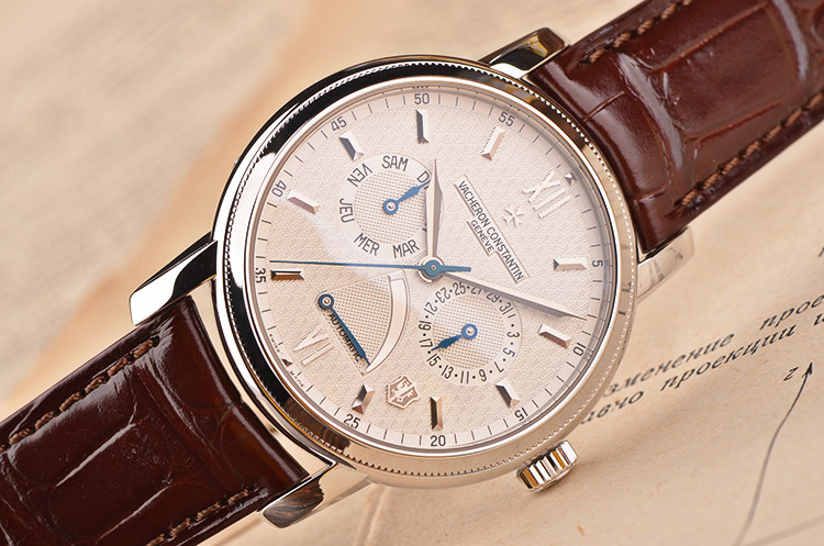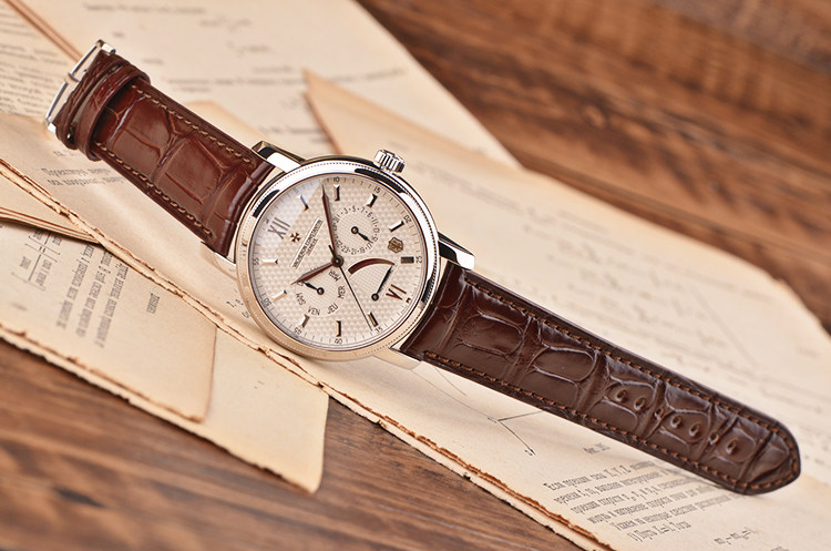 18K白金表壳及表扣,圣伯纳狗头印记。后配全新深棕色鳄鱼皮表带。蓝宝石水晶镜面及底盖,立体银白色精雕表盘,白金刻度及时分针,12点位附有1755年-2005年(江诗丹顿250周年纪念)签名。3点位指针式日历显示,6点位动力储备显示,9点位星期显示功能。4至5点位间白金日内瓦印记标识(VC唯一款表盘正面签名日内瓦印记腕表)。口径40MM*12.6MM。防水30M。