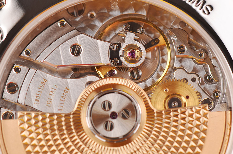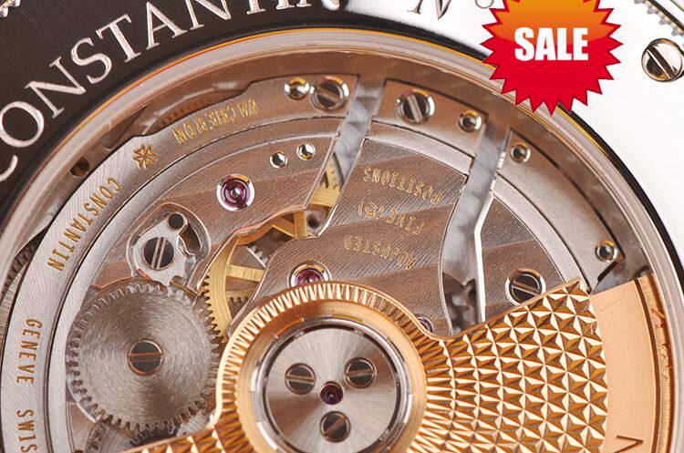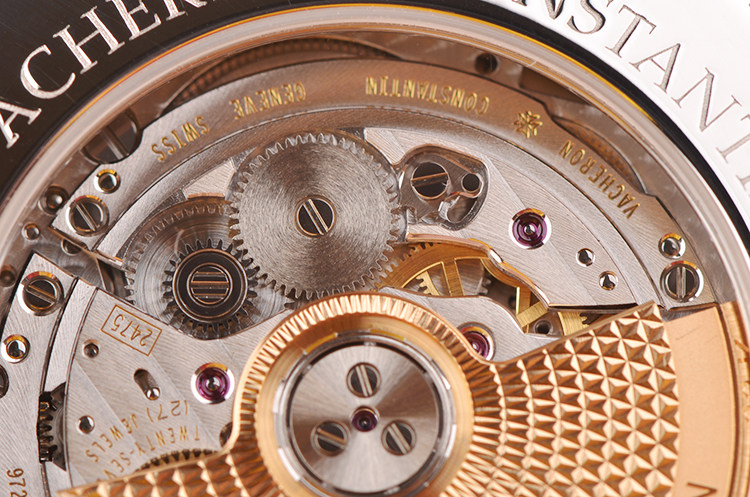 江诗丹顿自产CAL.2475型机芯,自动机械,极其精致日内瓦条纹打磨,倒角抛光修饰。27钻,5方位校正,摆频28800,22K黄金镌刻自动转陀,动力储存约43小时,走时状态极嘉。