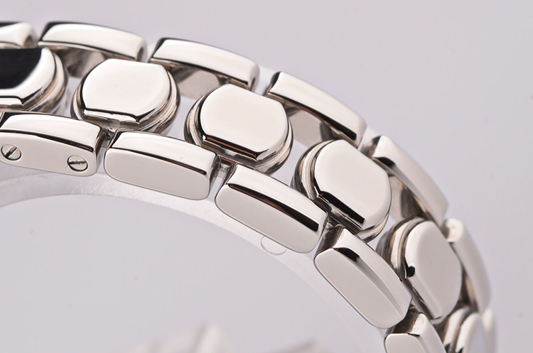 精钢表壳及链带,双向折叠表扣。蓝宝石水晶镜面及底盖,立体深灰色表盘,罗马数字刻度,3点及9点位两颗钻石时标。口径32MM*26MM*8.6MM,相当于圆表29MM左右大小。防水30M。