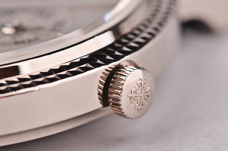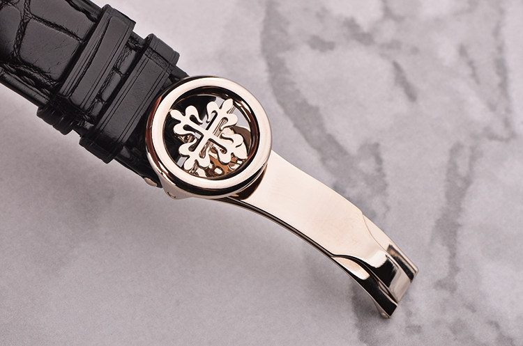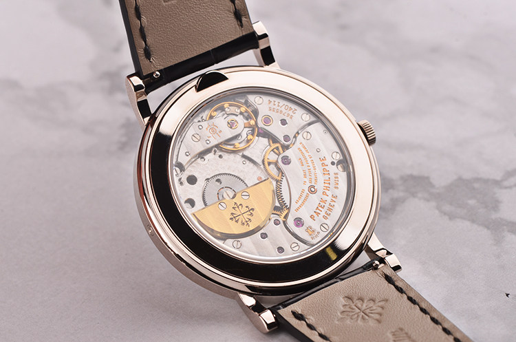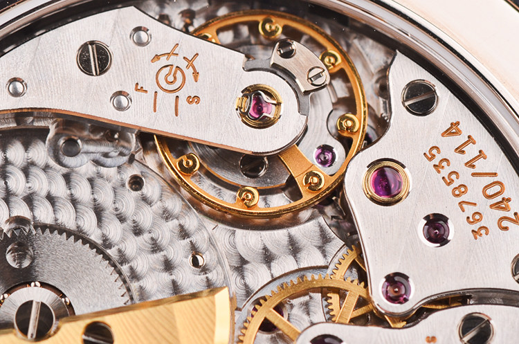 PP自产的CAL.240 Q型机芯,自动机械。万年历、月相功能。极其精致日内瓦条纹打磨,倒角抛光修饰。由275个零件组成,27钻,摆频21600,黄金镌刻自动摆陀,5方位校正,日内瓦印记。动力储备约48小时,走时状态极嘉。
