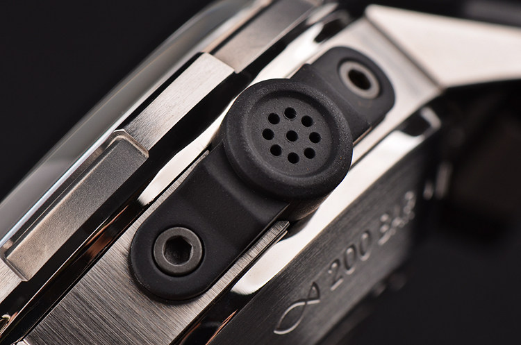 钛合金表壳及表扣,原厂黑色橡胶表带成色极新。钛合金可旋转计时表圈,其中前15分钟刻度有夜光。穹形蓝宝石水晶镜面,立体黑色竖条纹修饰表盘,夜光刻度及指针,3点位日历显示。潜水员头盔题材底盖,表壳侧面9点位橡胶涂层钛合金排氦气阀,旋入式橡胶涂层钛合金防水表冠。口径46MM*20.5MM。专业潜水腕表,防水深达2000M。