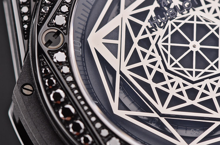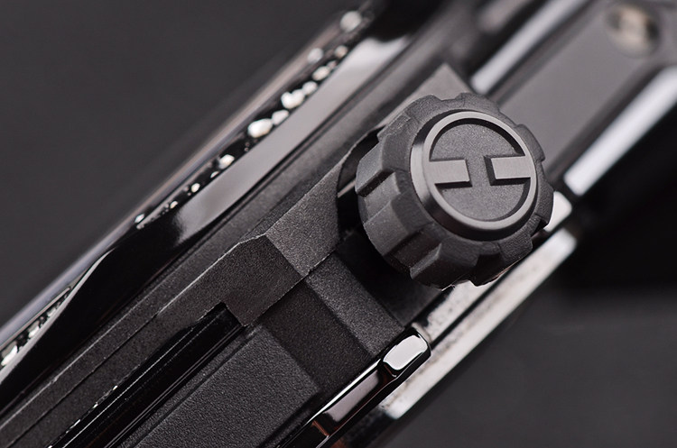 黑陶瓷及钛合金表壳及折叠款式表扣,原厂快拆式小牛皮内衬橡胶表带成色很新。表壳及表耳原厂镶嵌黑色天然美钻。蓝宝石水晶镜面及底盖,立体三层镂空8边型表盘,底层实心三角指示小时,中间层实心三角指示分钟,最上层为转动的秒针,设计独具创意与美感。橡胶裹覆钛合金旋入式防水表冠。口径45MM*15.9MM。防水100M。