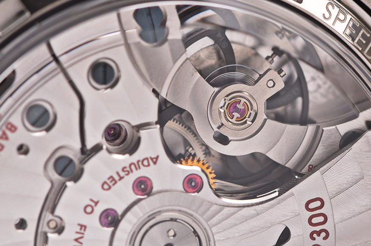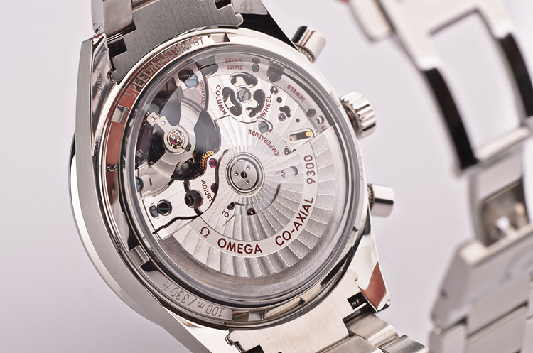 欧米茄自产CAL.9300型机芯,同轴自动机械,计时及日历功能。极其精致日内瓦条纹打磨,倒角抛光修饰。配备纵轮计时装置,搭载带有硅游丝的无卡度游丝摆轮和接续排列的双发条盒,双向自动上链系统。机芯镀铑表面饰有独特的阿拉伯风格日内瓦波纹。天文台认证机芯,54钻,摆频28800,5方位校正,动力储存约60小时,走时状态极嘉。
