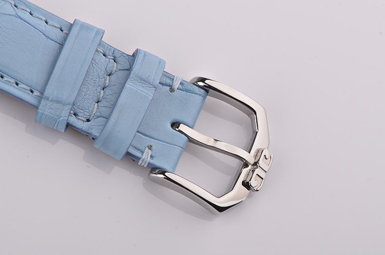 精钢表壳及表扣,表壳左右两侧原厂镶嵌hao华天然美钻。后配全新浅蓝色鳄鱼皮表带。蓝宝石水晶镜面及底盖,立体蓝色珍珠贝母表盘,12颗钻石时标,6点位日历窗口。口径42.5MM*30.5MM*10.3MM,相当于圆表37MM左右大小,防水30M。