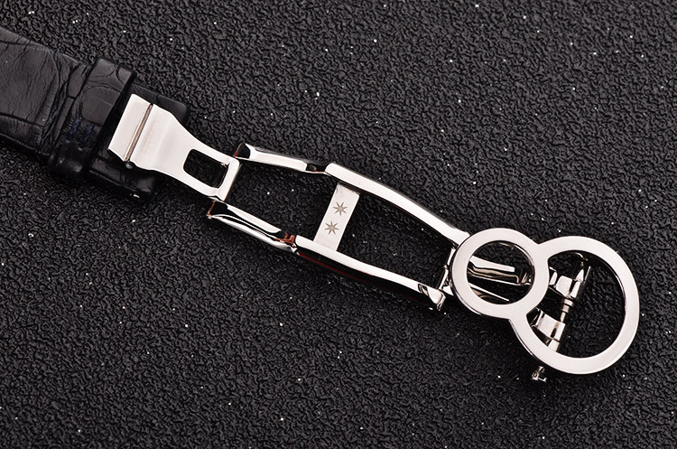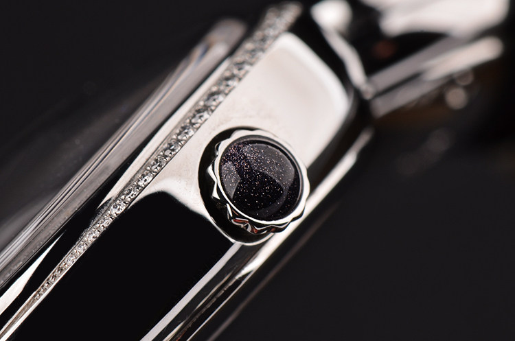 精钢8字形表壳及折叠式表扣,表壳原厂镶嵌48颗hao华天然美钻(共计约0.53克拉),8字小圈内镶有一颗可活动砂金石凸圆宝石。后配黑色鳄鱼皮表带成色较新。拱形蓝宝石水晶镜面及底盖,黑色拱形沙金石表盘,高亮银色表内圈搭配黑色圆点刻度,设计简约别致。口径35MM*12.7MM。防水30M。