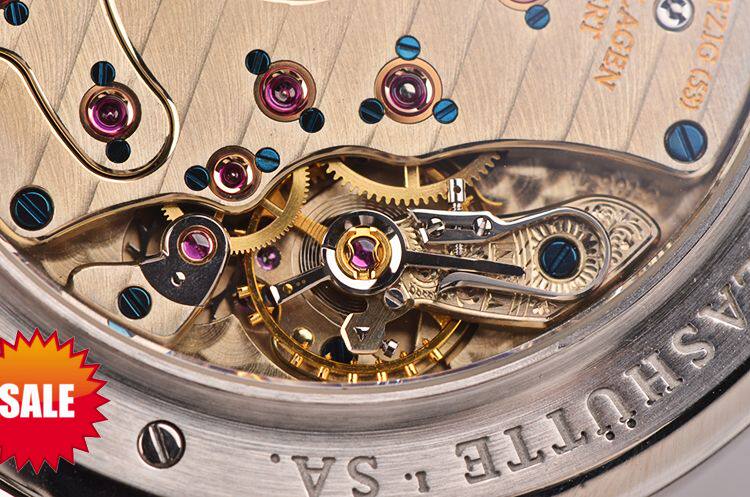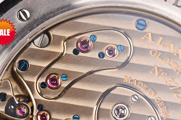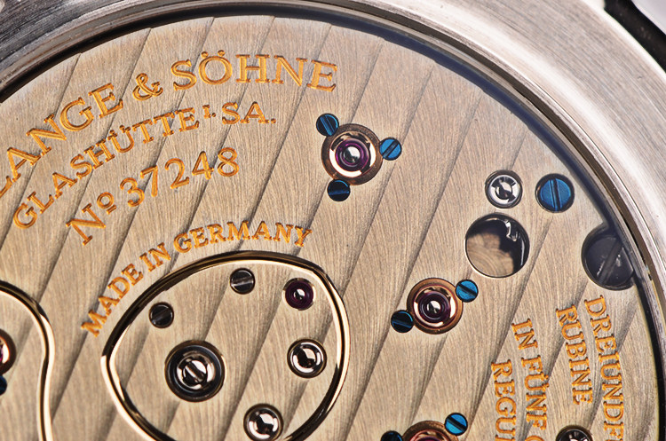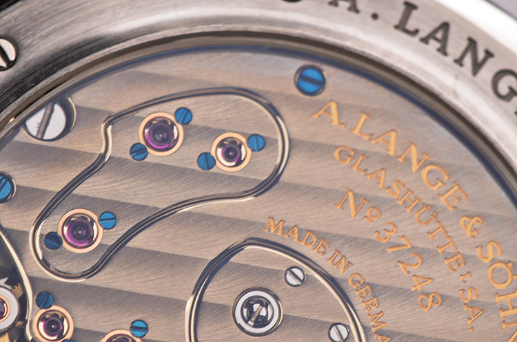 A Lange & Sohne自产的CAL.L901.2型机芯,手上链,极其精致人手条纹打磨,德国银夹板,倒角抛光修饰,黄金套筒,5方位校正,手工镌刻鹅颈微调,53钻,摆频21600,动力储存约72小时,三天链。走时状态极嘉。