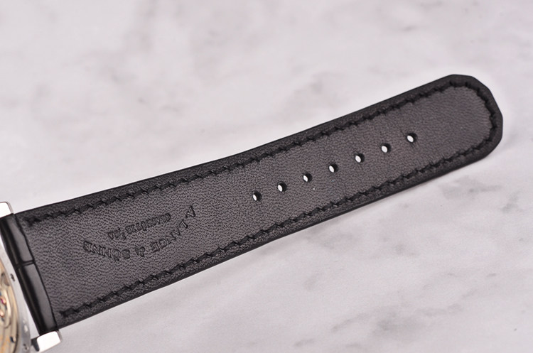 PT950铂金表壳及折叠式表扣,圣伯纳狗头印记。后配全新黑色鳄鱼皮表带。蓝宝石水晶镜面及底盖,立体银灰及银白双色表盘,白金刻度及指针,偏心小三针,大日历视窗,指针式动能储备显示。表壳侧面10点位日历快调按钮。口径41.9MM*11MM。防水30M。