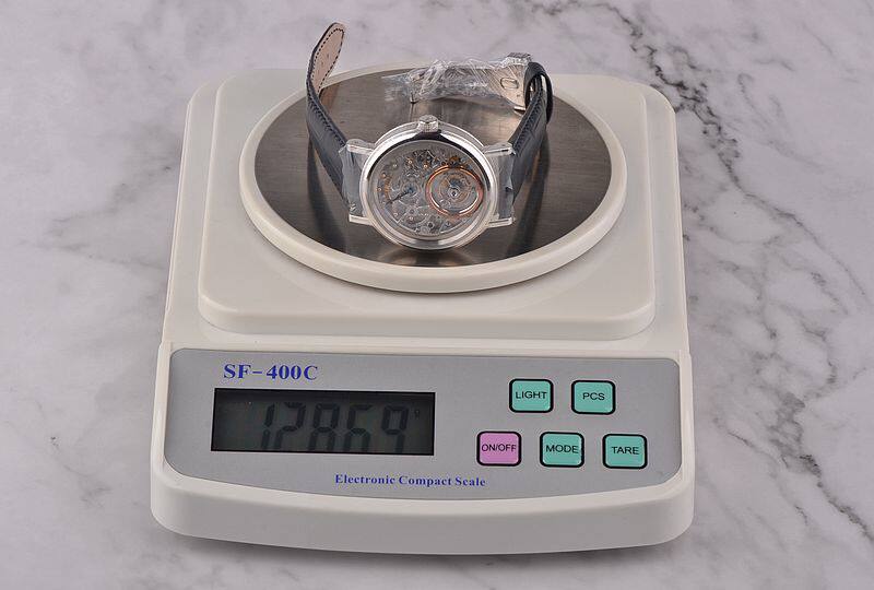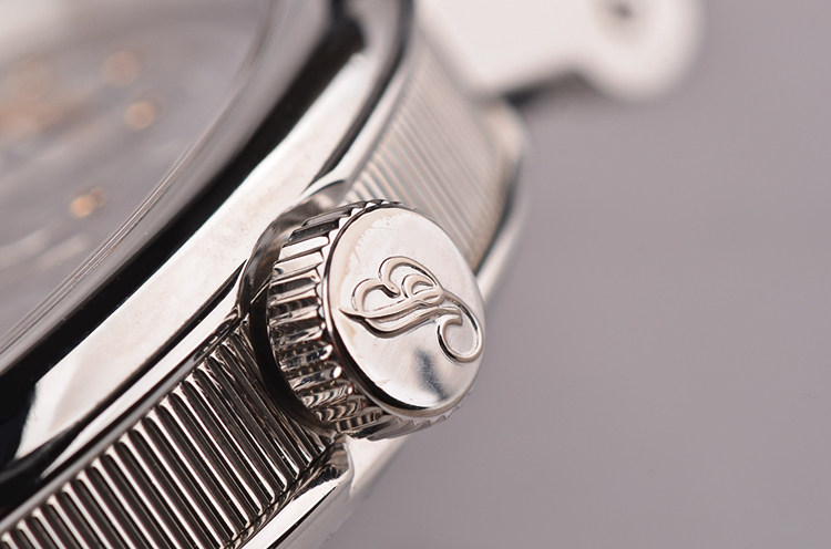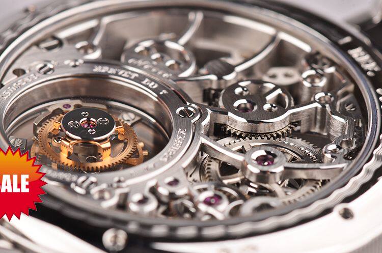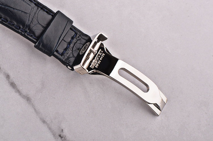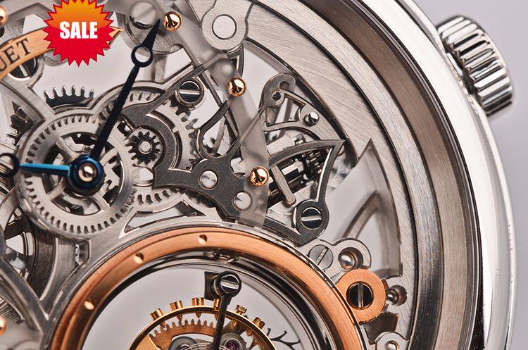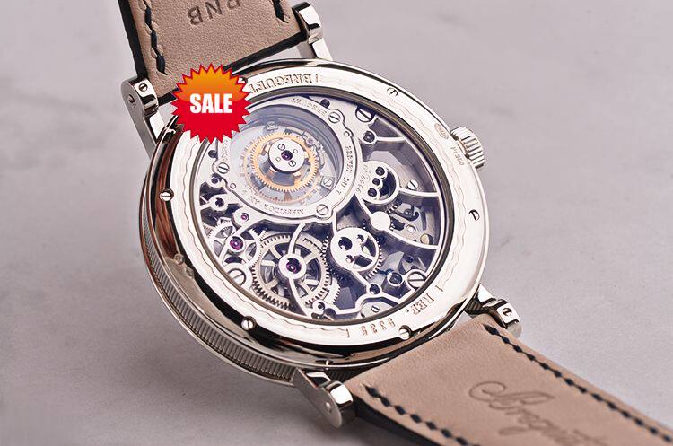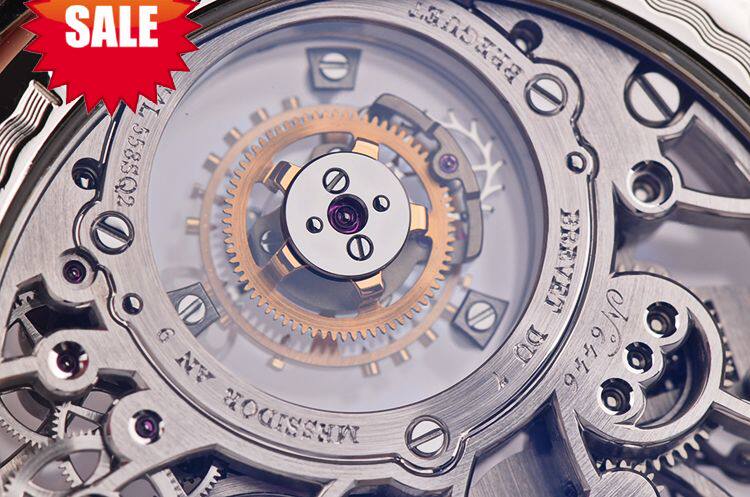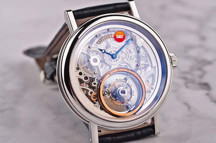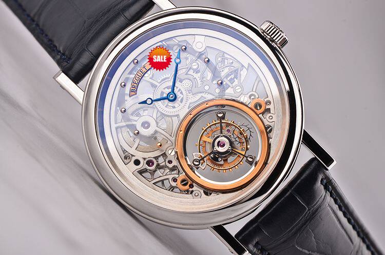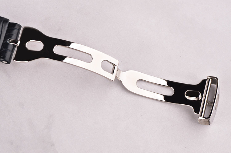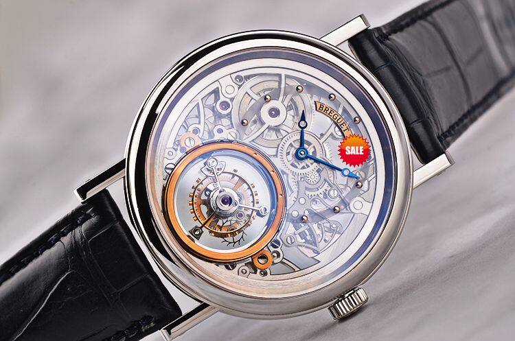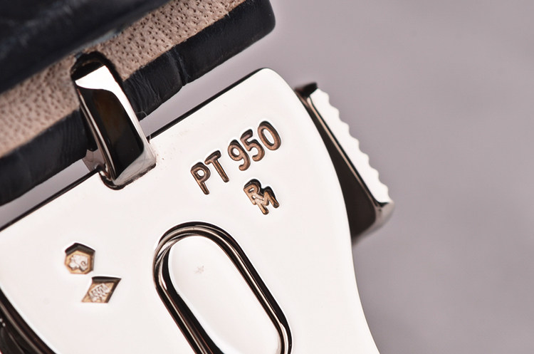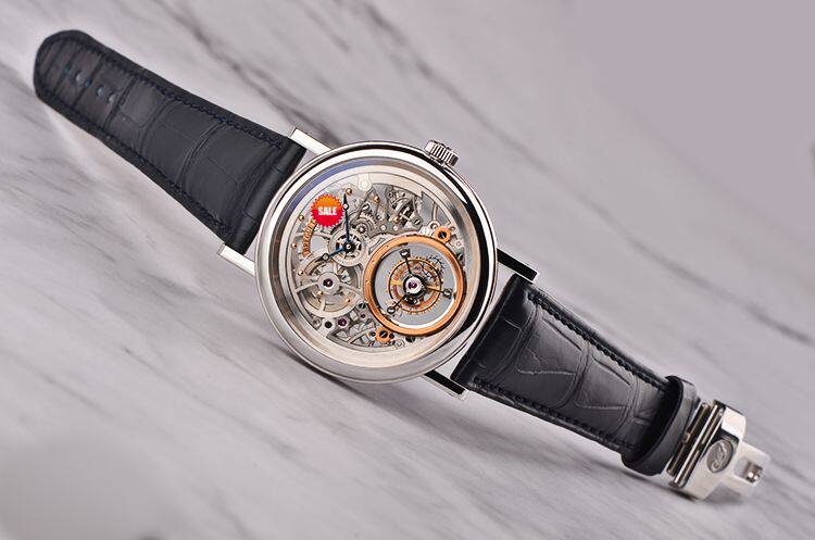 PT950铂金表壳及折叠式表扣,圣伯纳狗头印记。后配全新黑色鳄鱼皮表带。蓝宝石水晶镜面及底盖,立体全镂空表盘,蓝钢宝玑指针,6点位一分钟陀飞轮装置。口径40MM*9.65MM。防水30M。