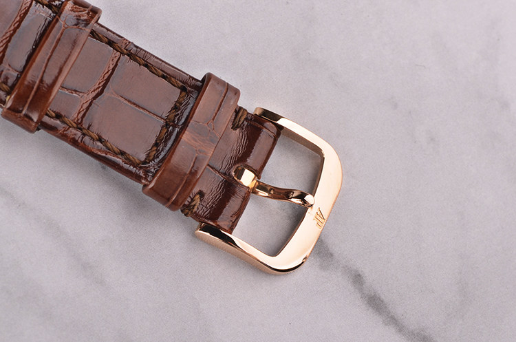 18K玫瑰金表壳及表扣,圣伯纳狗头印记。后配全新原厂亮光棕色鳄鱼皮表带。蓝宝石水晶镜面及底盖,立体银白色太阳纹表盘,玫瑰金刻度及指针,3点位日历显示功能。口径39MM*9MM,防水20M。