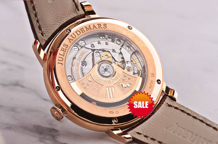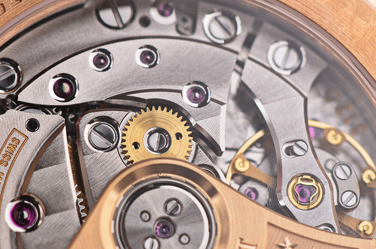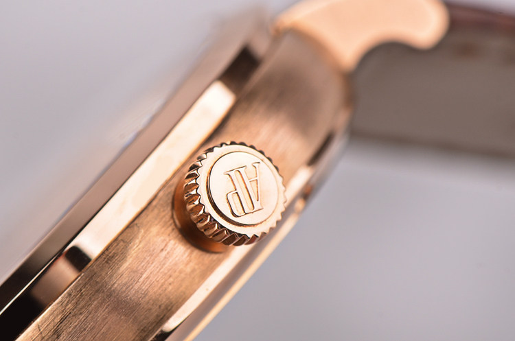 AP自产的CAL.3120型机芯,自动机械,极其精致日内瓦条纹打磨,倒角抛光修饰。有280个零件组成,40钻,摆频21600,18K玫瑰金镌刻自动转陀。动力储存约60小时,机芯有独立签署。走时状态极嘉。