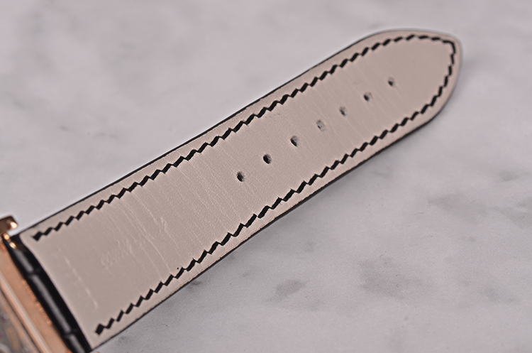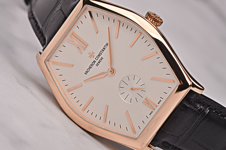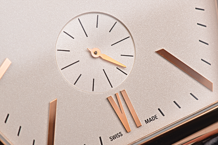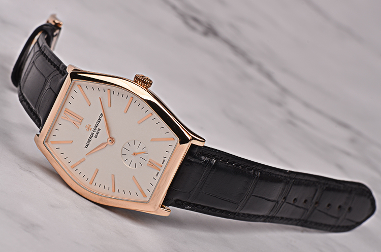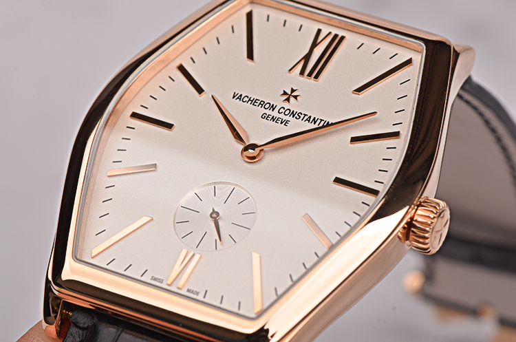 18K酒桶型玫瑰金表壳及表扣,圣伯纳狗头印记。后配棕色鳄鱼皮表带成色很新。蓝宝石水晶镜面及底盖,立体银白色细喷砂表盘,玫瑰金刻度及指针,6点位独立小秒针,口径47.6MM*36.7MM*9.25MM,相当于圆表41MM左右大小。防水30M。