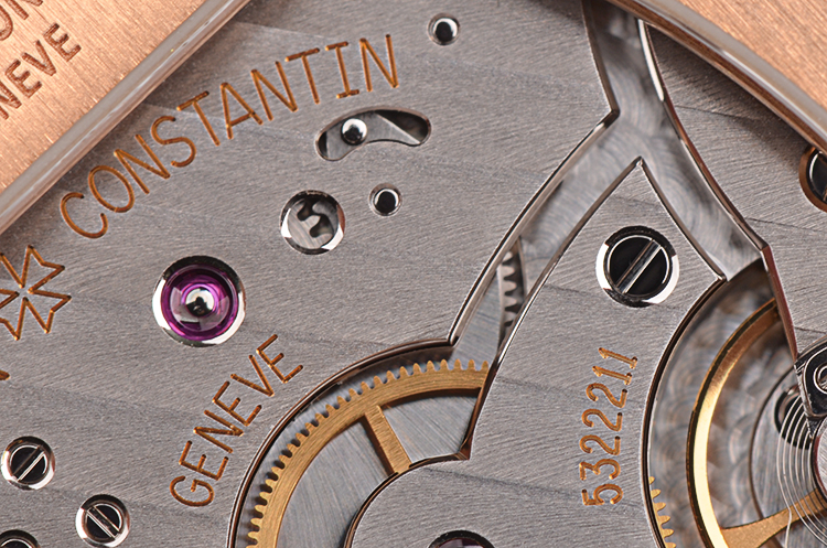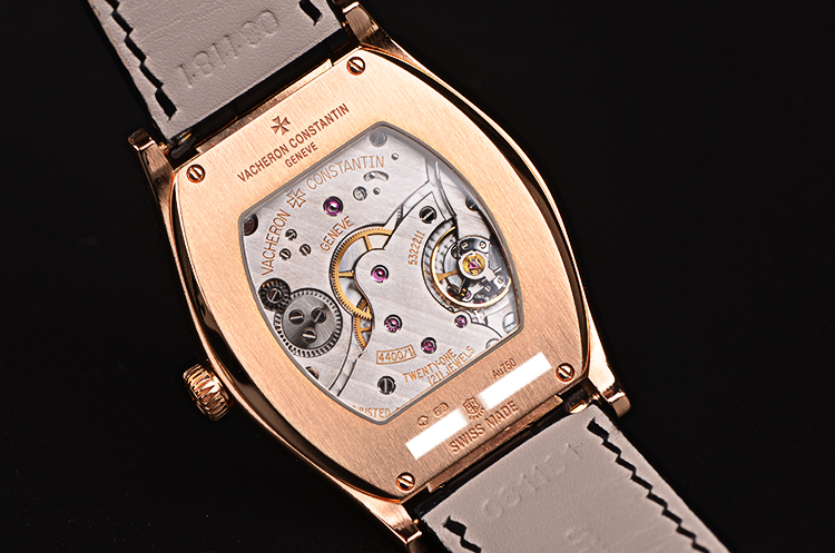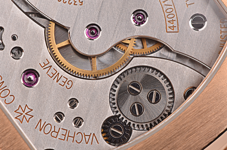 VC自产CAL.4400 AS型机芯,手上链,日内瓦印记,极其精致日内瓦条纹打磨,倒角抛光修饰。由127个零件组成,21钻,摆频28800,动力储存约65小时,走时状态极嘉。