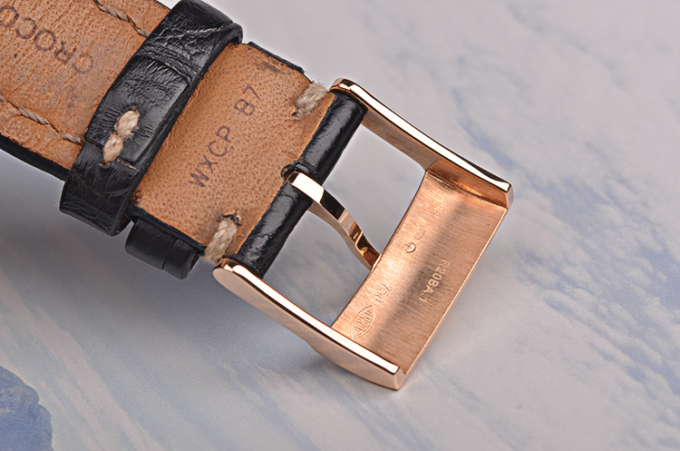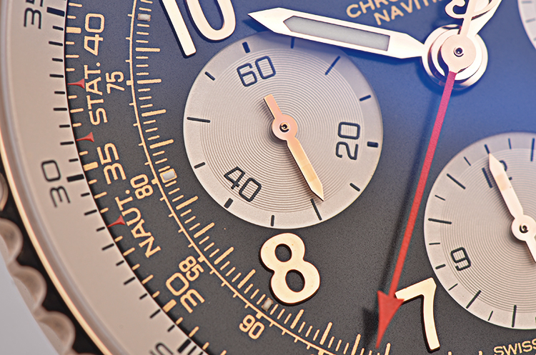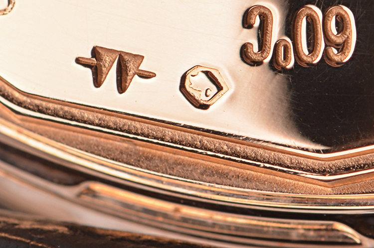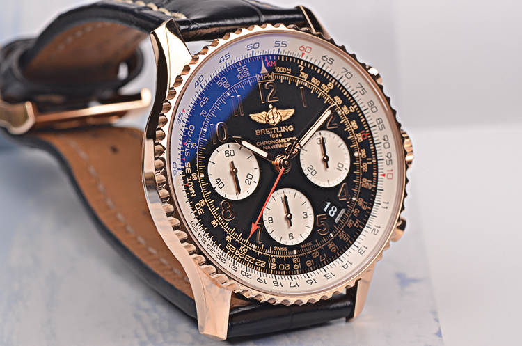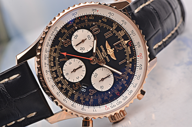 18K玫瑰金表壳及表扣,圣伯纳狗头印记。原厂黑色鳄鱼皮表带成色较新。双向旋转玫瑰金飞行滑尺表圈,金色刻度计时码表内圈,抗反光镀层蓝宝石水晶镜面,立体黑色计时表盘,玫瑰金阿拉伯数字刻度及指针,3点位30分钟计时,6点位12小时计时,9点位独立小秒针,4至5点位间日历窗口。天文台认证标识。口径43MM*14.25MM,防水30M。