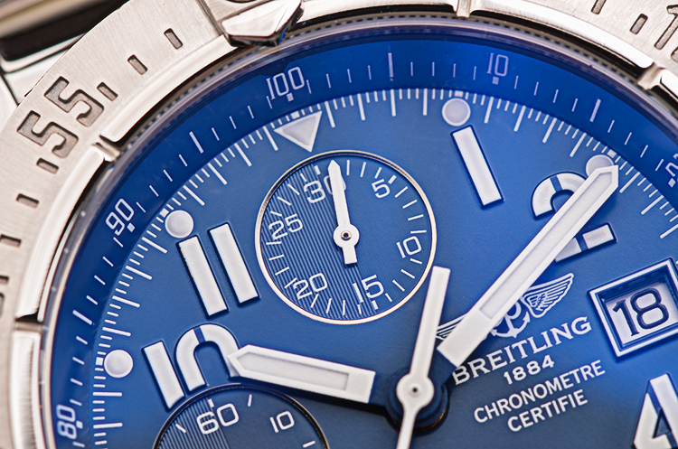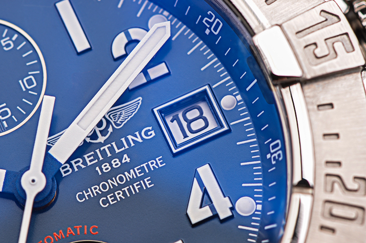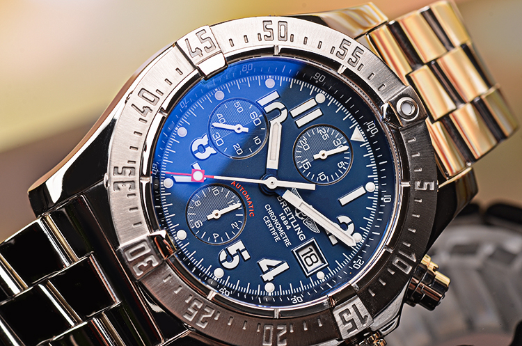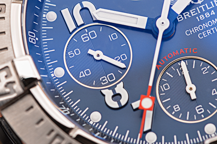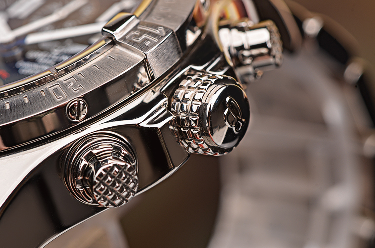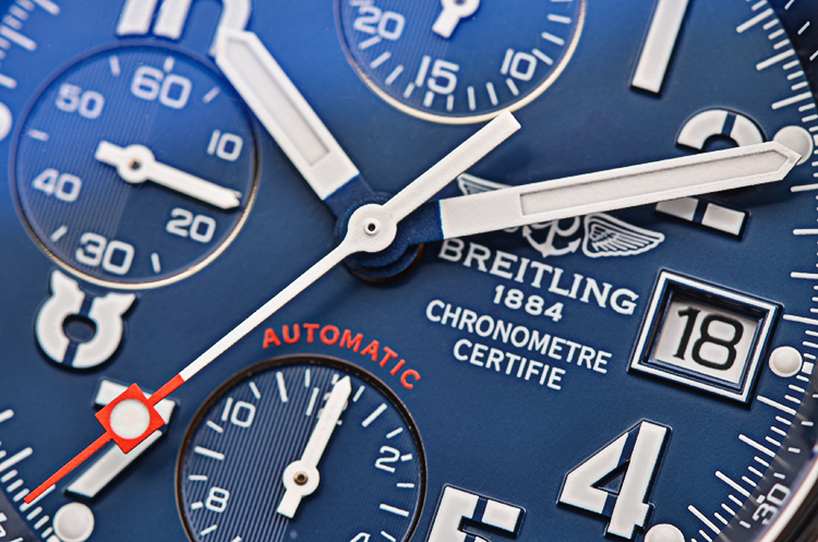 精钢表壳及链带,双保险折叠表扣。精钢单向可旋转计时表圈。蓝宝石水晶镜面,立体蓝色计时表盘,阿拉伯数字刻度,夜光指针及刻度外沿的圆点刻度,天文台认证标识,12点位30分钟计时,3点位日历显示功能,6点位12小时计时,9点位独立小秒针。旋入式防水表冠。口径45MM*17.5MM。防水300米。