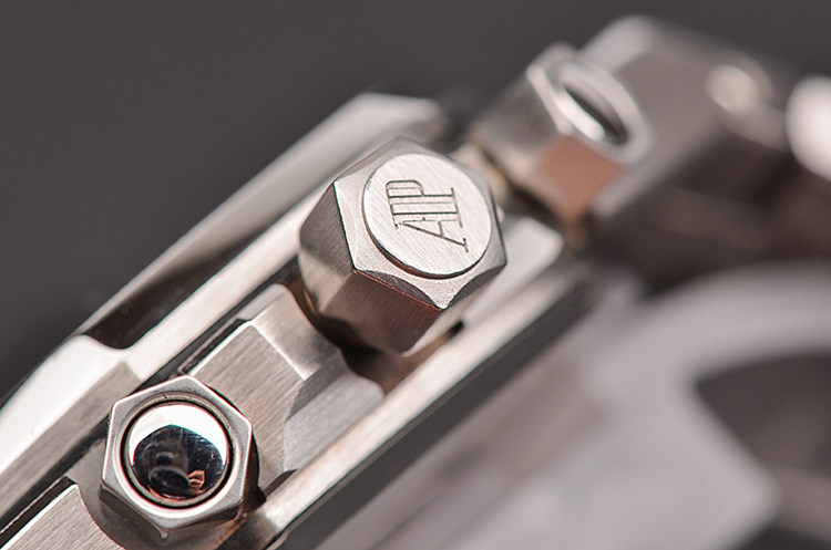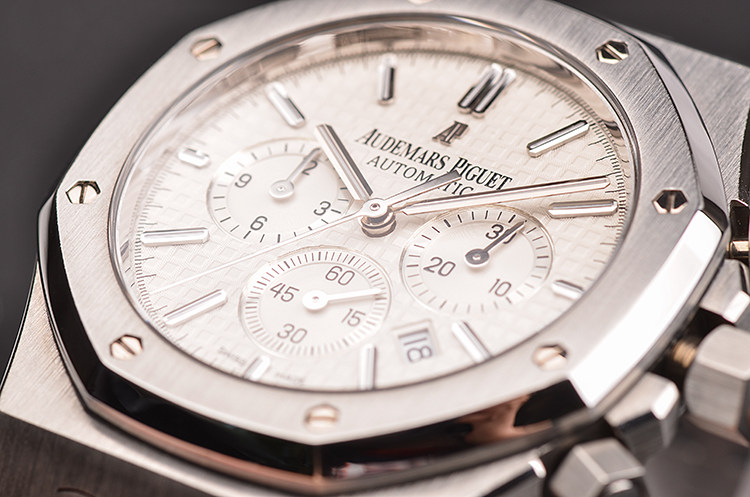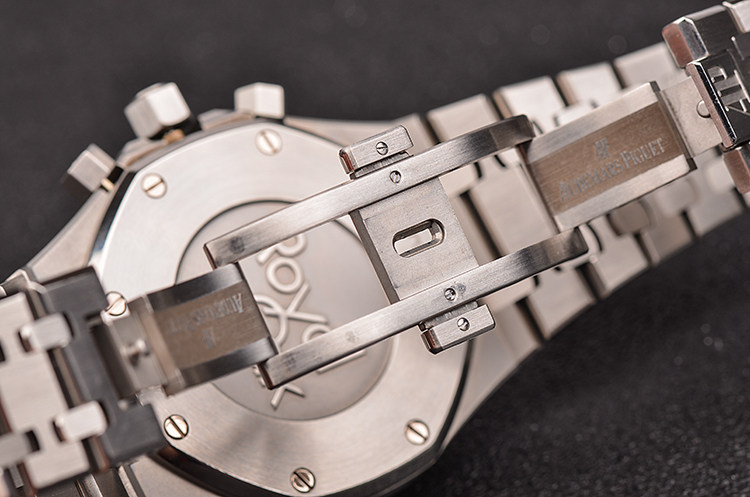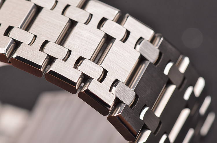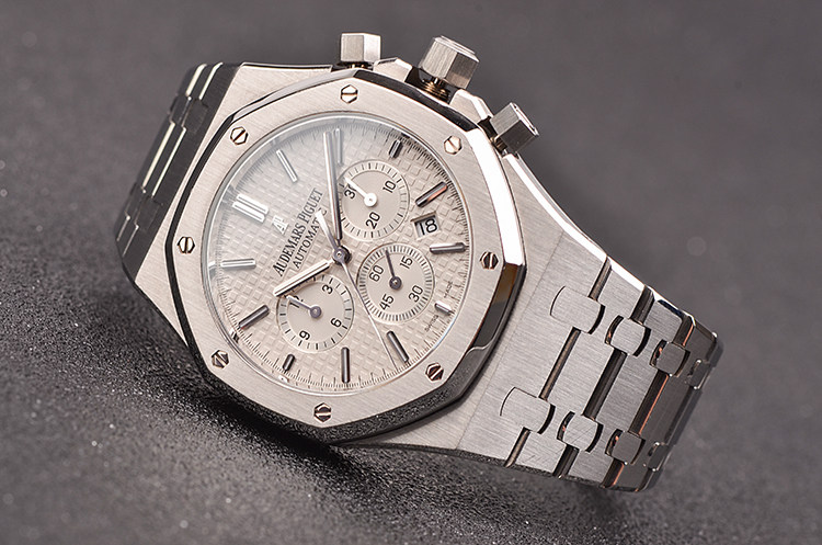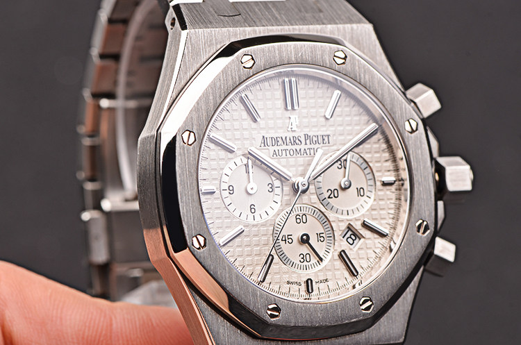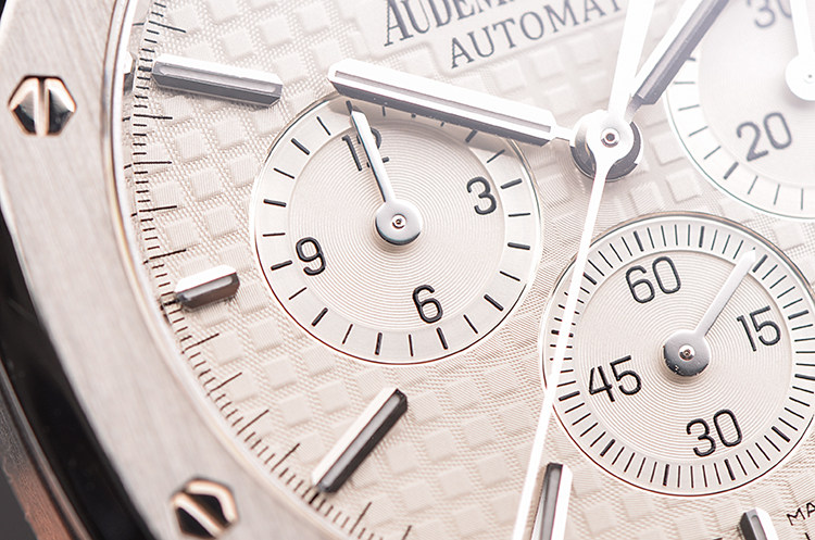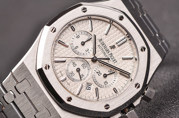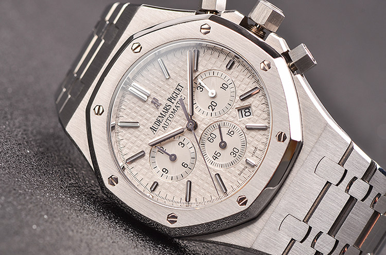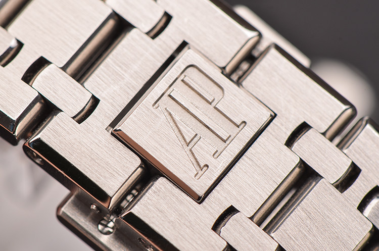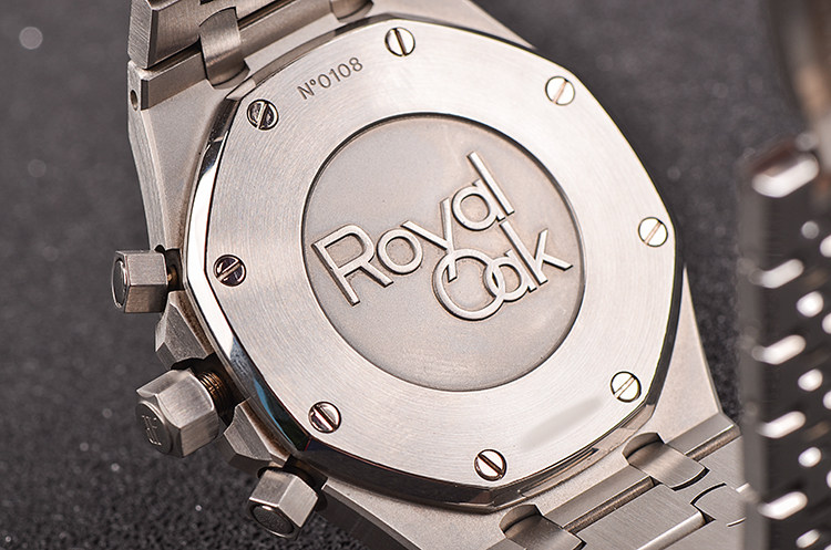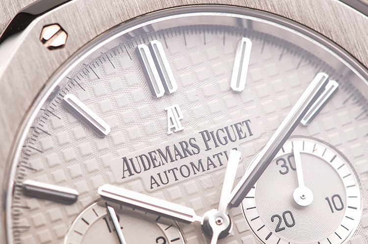 精钢八角皇家橡树表壳及链带,折叠式表扣。前后盖白金螺丝。蓝宝石水晶镜面,银色表盘镌刻Grande Tapisserie 大格纹装饰图案,搭配白金荧光立体时标和皇家橡树指针。9点位12小时计时,6点位独立小秒针,3点位30分钟计时,4点位日历显示功能。口径41MM*10.8MM,防水50M。