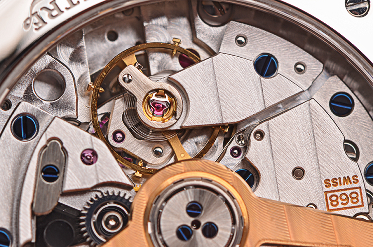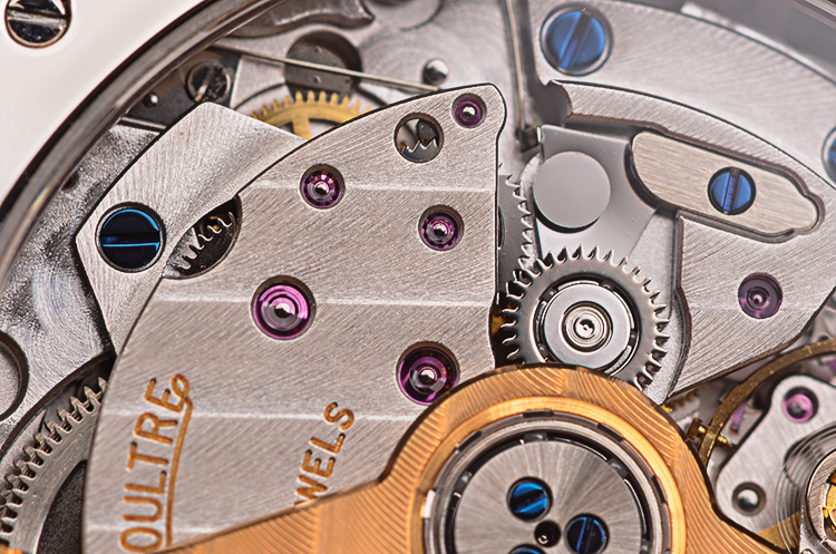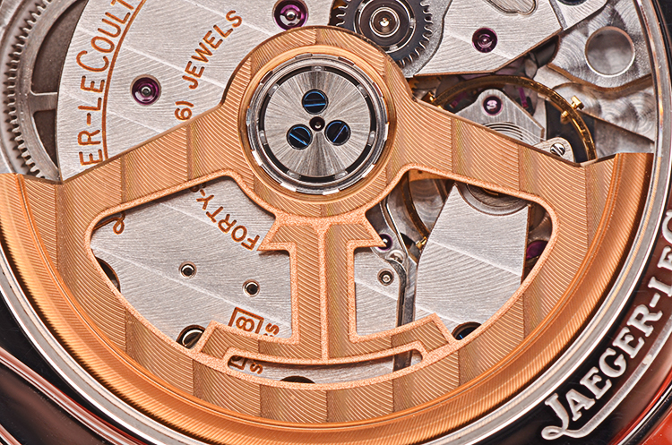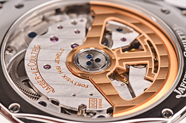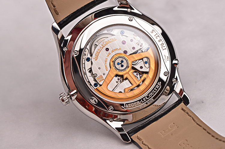 积家自产CAL.868/1型机芯,自动机械,万年历,昼夜显示,月相功能。极其精致日内瓦条纹打磨,由336个零件组成,46钻,摆频28800,18K玫瑰金镂空自动转陀,动力储存约38小时。走时状态极嘉。