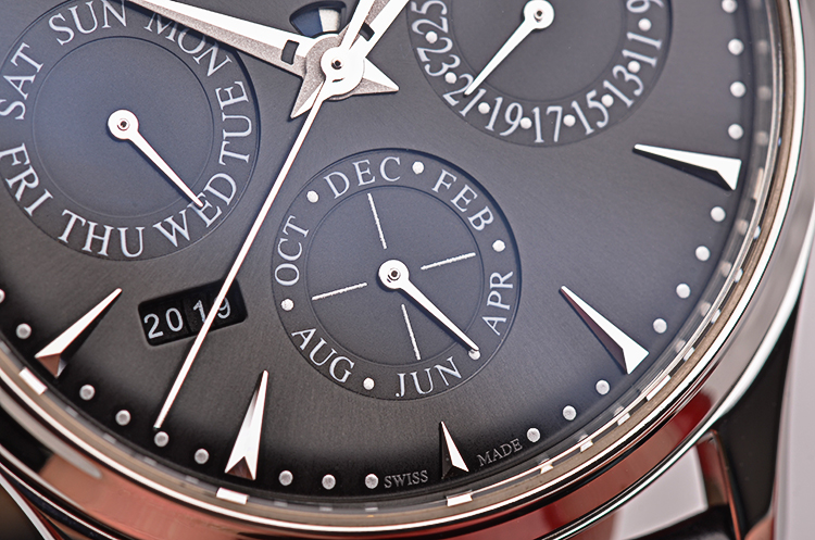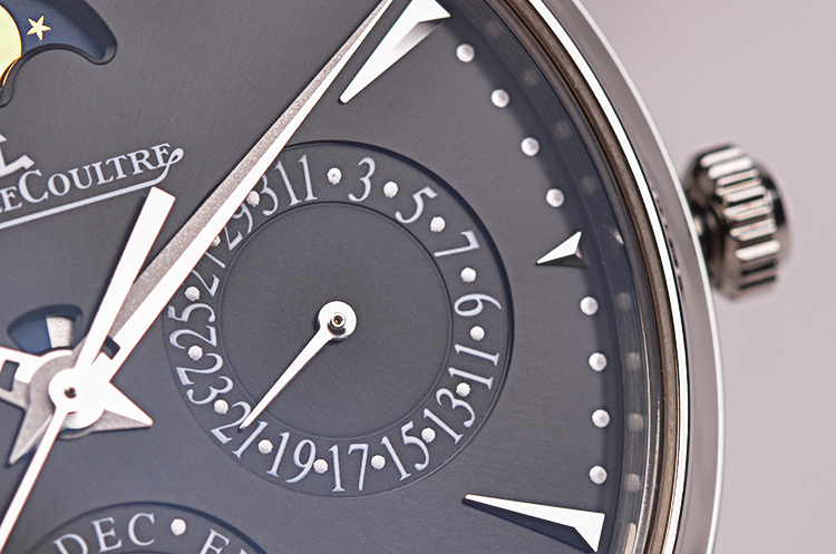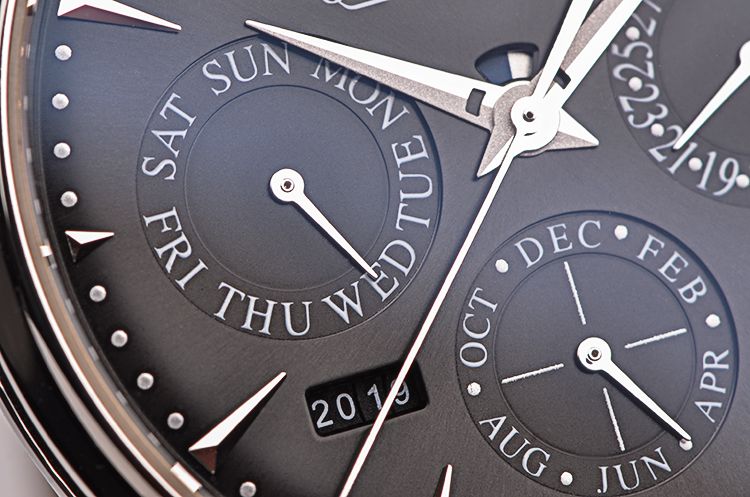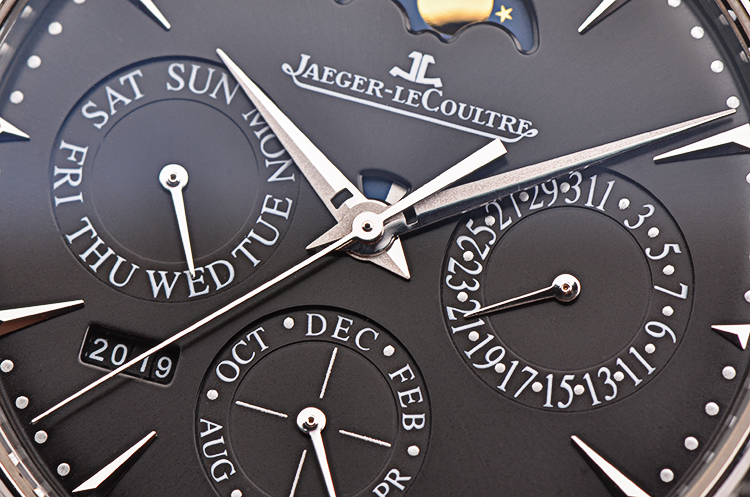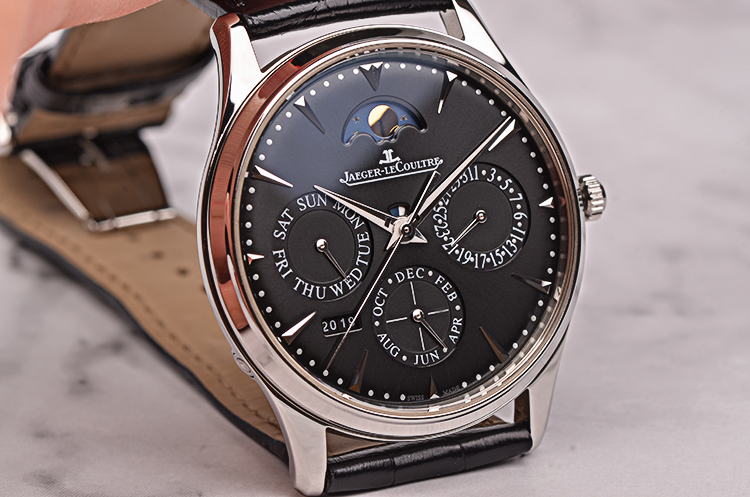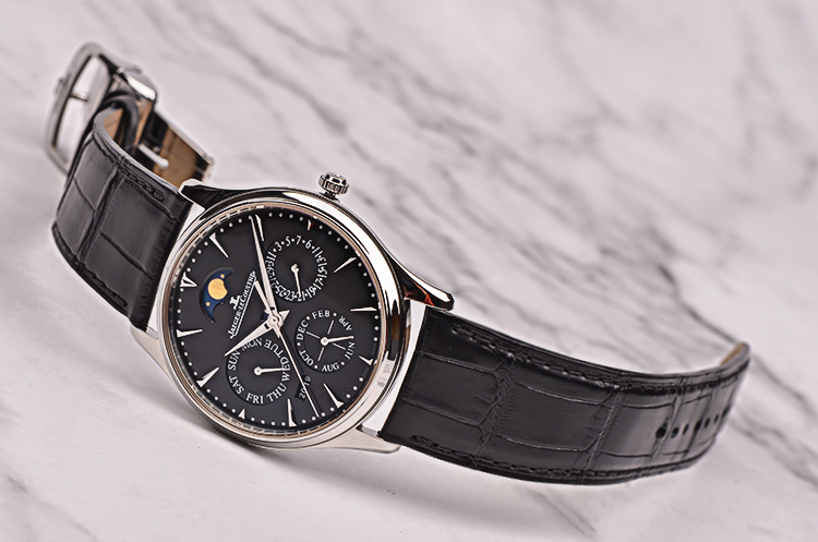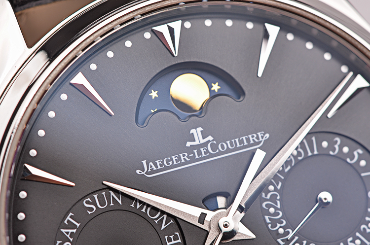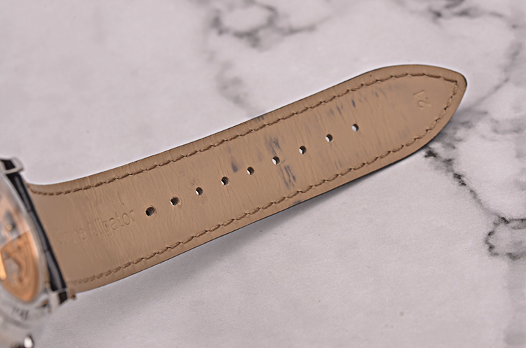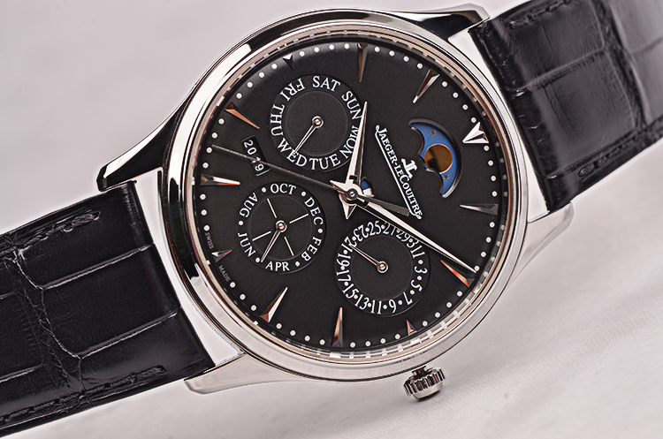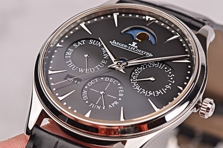 精钢表壳及折叠式表扣,原厂黑色鳄鱼皮表带成色极新。蓝宝石水晶镜面及底盖,立体黑色万年历表盘,太妃指针,昼夜显示,月相显示功能。口径39MM*9.2MM。防水50M。