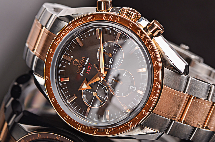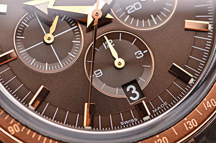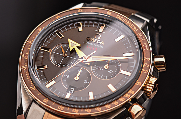 玫瑰金及精钢表壳及链带,折叠式表扣。圆拱形蓝宝石水晶镜面及底盖,立体深棕色计时表盘,棕色测速计表圈,玫瑰金刻度及指针,刻度外圈及时分针有夜光。3点位30分钟计时圈,6点位12小时计时及日历显示窗口,9点位独立小秒针。口径42MM*15MM。防水100M。