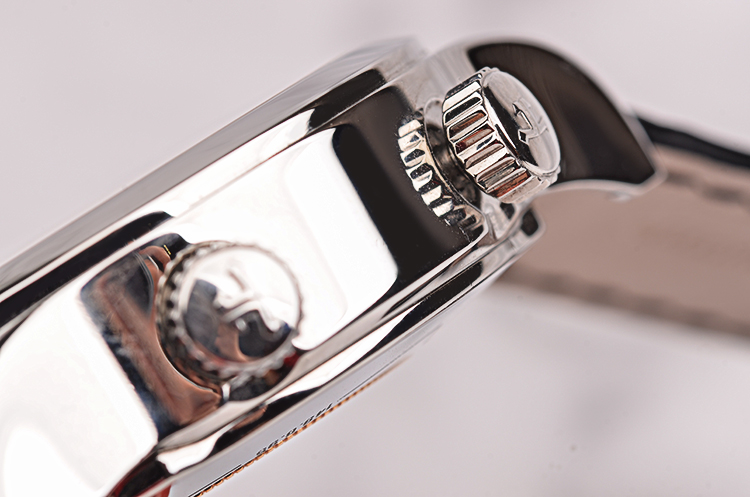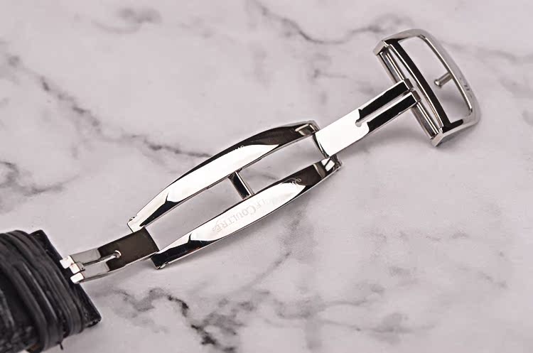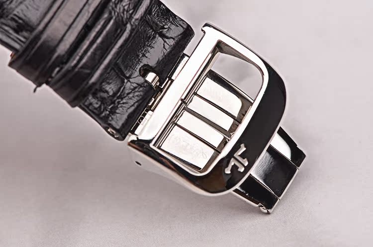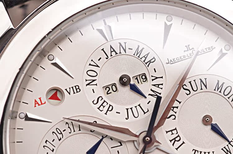 精钢表壳及折叠式表扣,后配全新黑色鳄鱼皮表带。蓝宝石水晶镜面,立体银白色表盘,万年历,南北月相,昼夜显示,闹铃功能。表壳侧面2点位闹铃发条及闹铃时间调校旋钮,9至10点位声音闹铃及震动闹铃切换按钮。金质积家1000小时测试徽章底盖。口径43MM*15.8MM。防水50M。