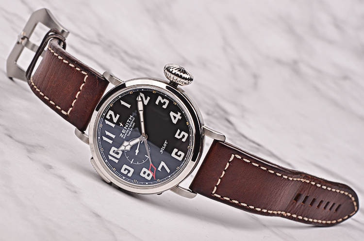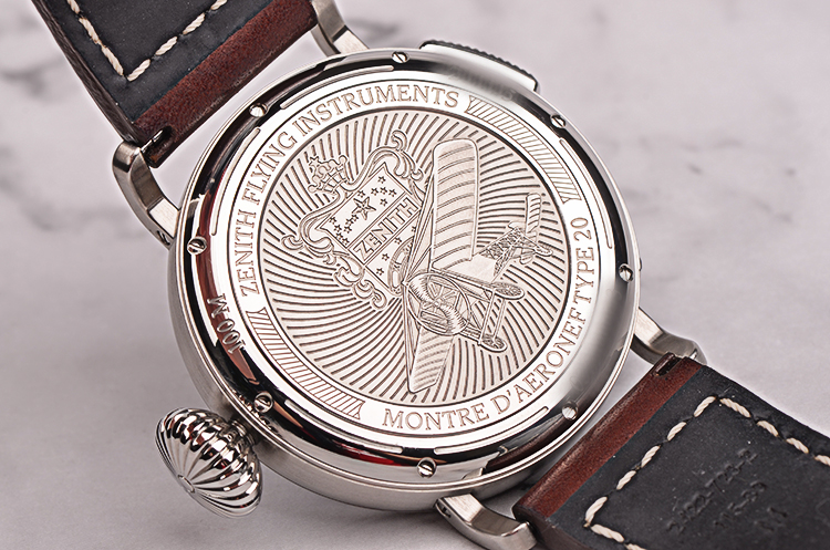 精钢表壳及表扣,原厂棕色小牛皮表带成色极新。圆拱形蓝宝石水晶镜面,立体黑色表盘,夜光阿拉伯数字刻度及时分针,表盘最外圈刻度位GMT第二时区24小时制时标,红色镂空箭头GMT第二时区指针。密底工艺,钛合金后盖上镌刻 Louis Blériot 于 1909 年佩戴真力时腕表穿越英吉利海峡时驾驶的飞机以及飞行仪表标识,并搭配受传奇法国飞行员飞机机身启发的装饰图案。口径48MM*15.8MM。旋入式洋葱头表冠,防水100M。