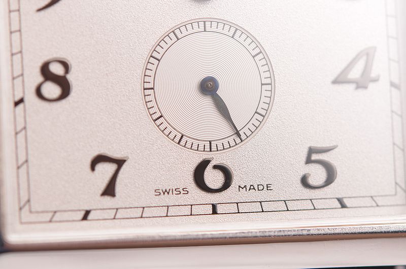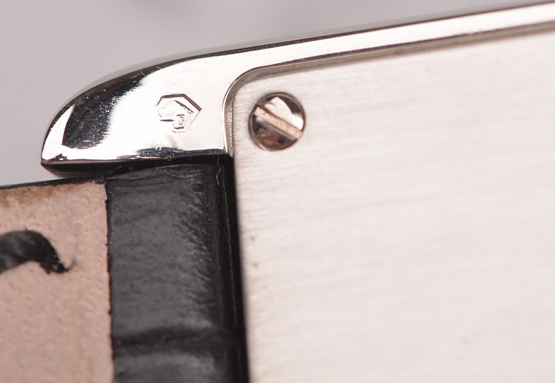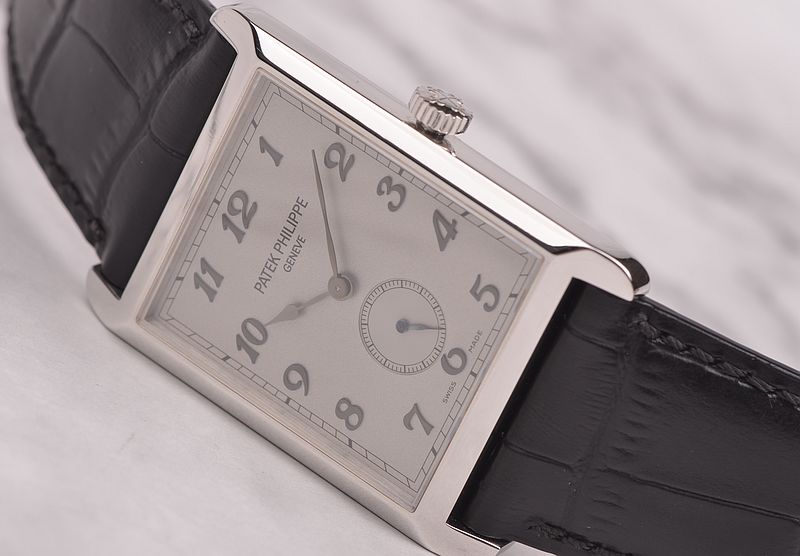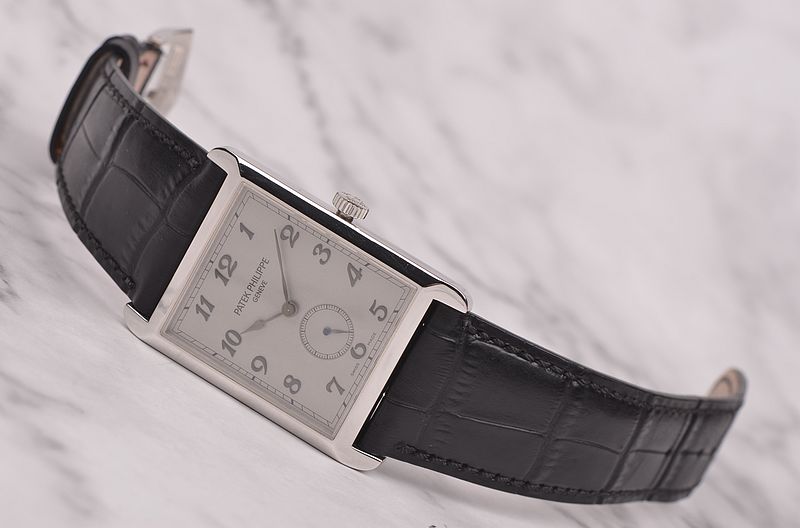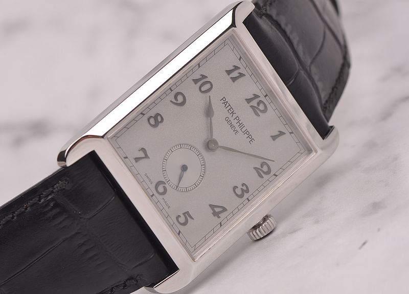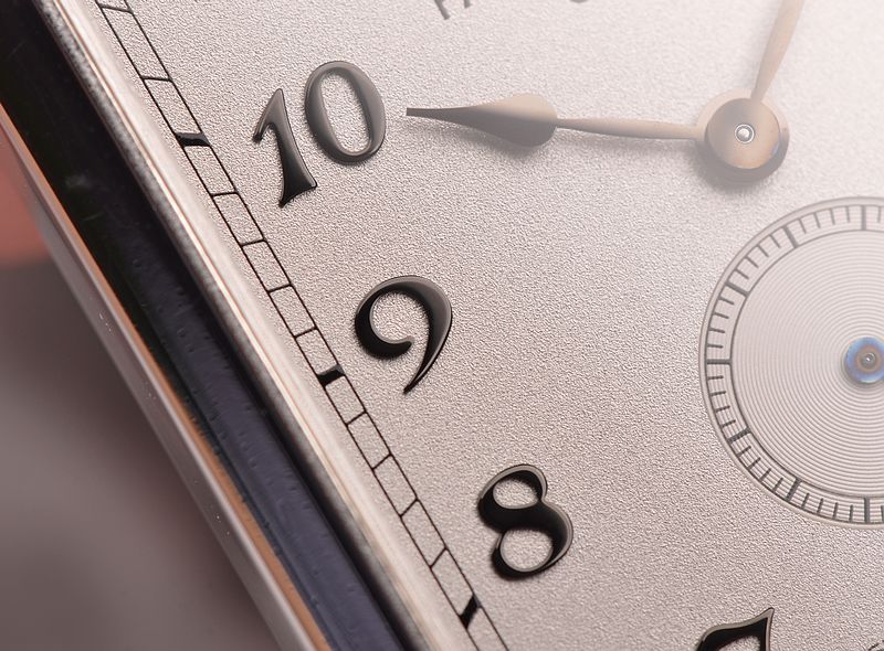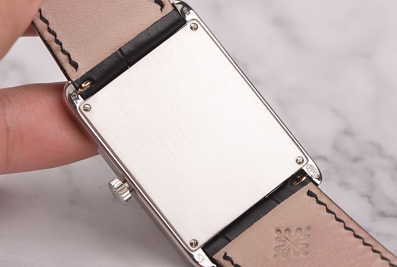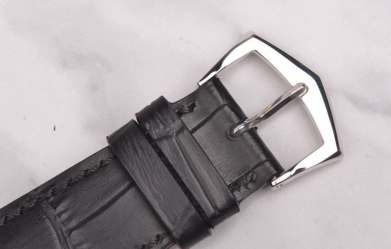 18K玫白金表壳及表扣,圣伯纳狗头印记。后配黑色鳄鱼纹牛皮表带成色极新。蓝宝石水晶镜面,立体银灰色喷砂表盘,镀铑阿拉伯数字时标及指针,6点位独立小秒针。口径43MM*30MM*5.85MM,相当于圆表39MM左右大小,防水25M。