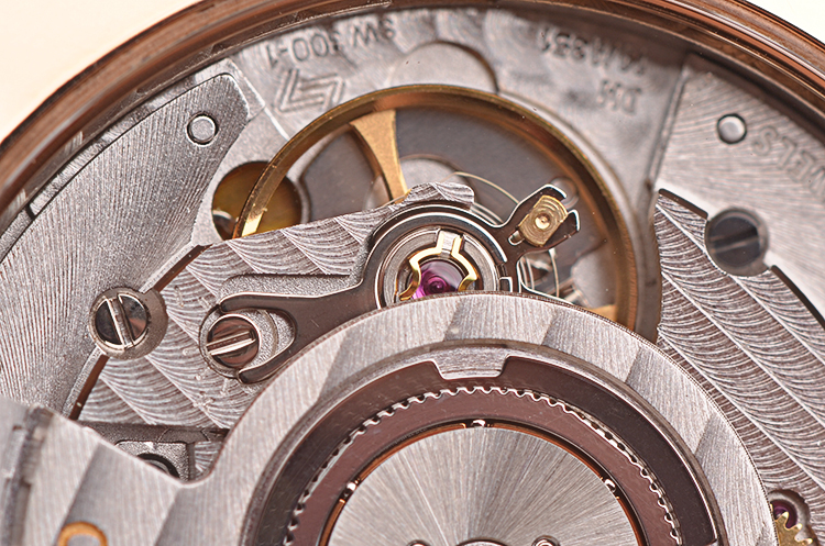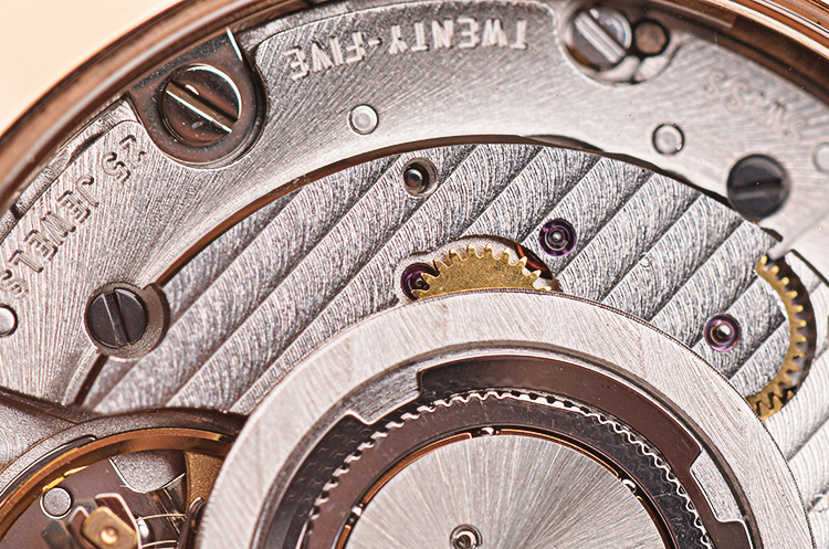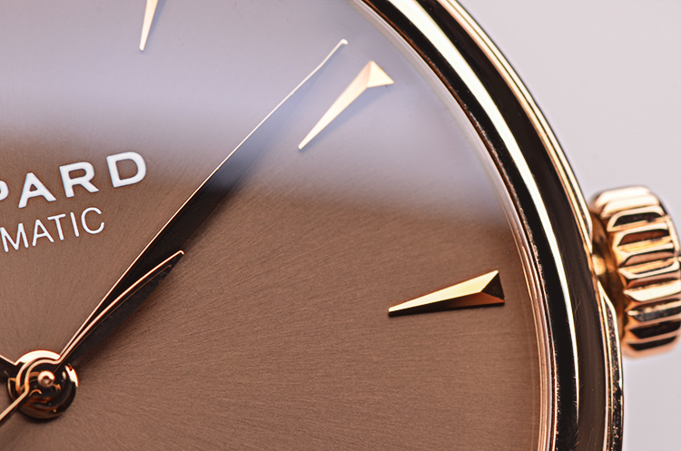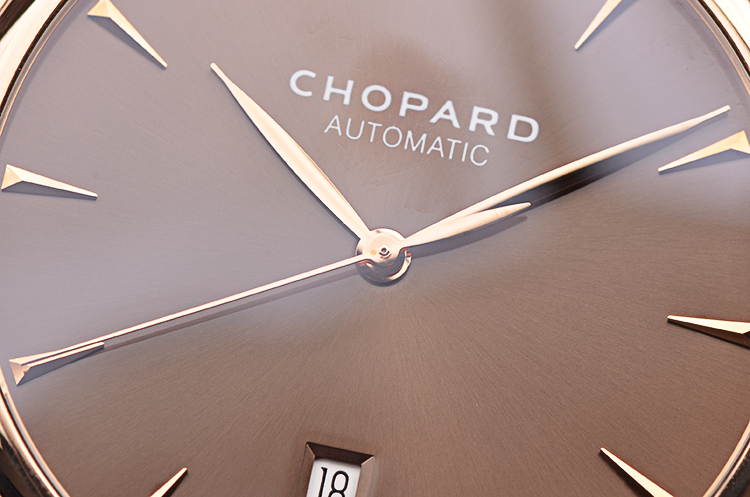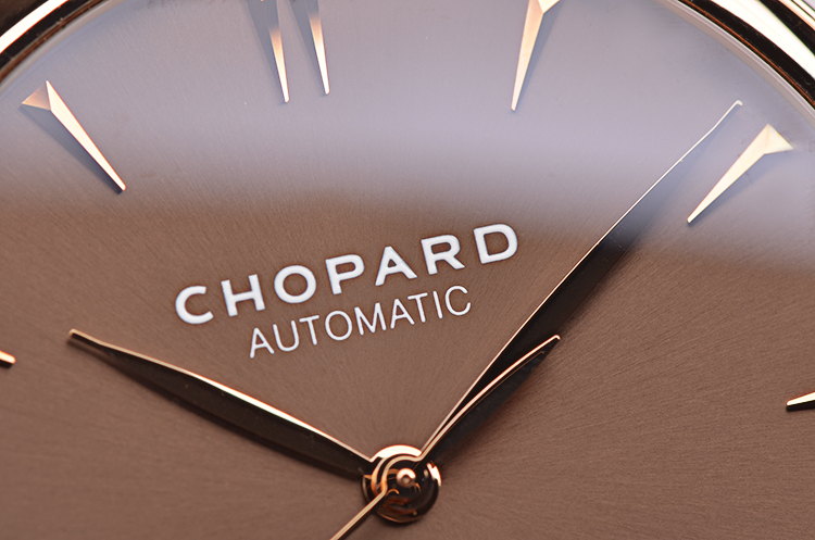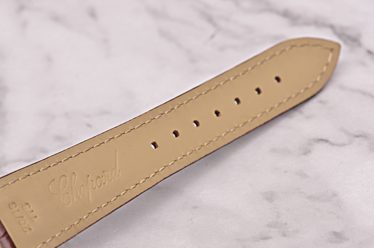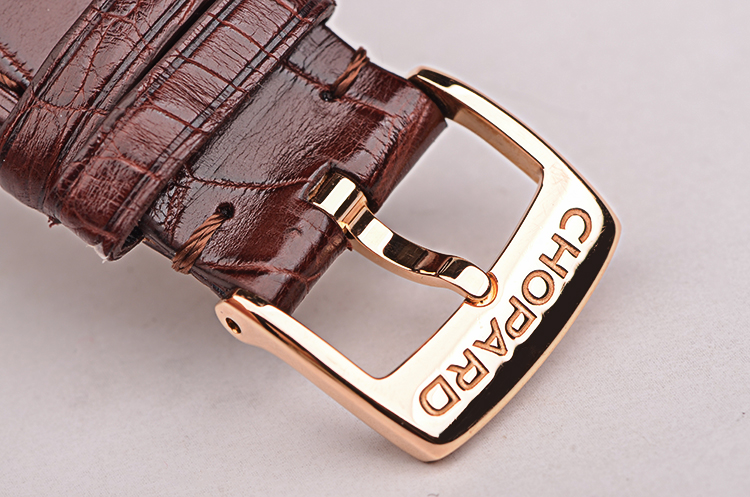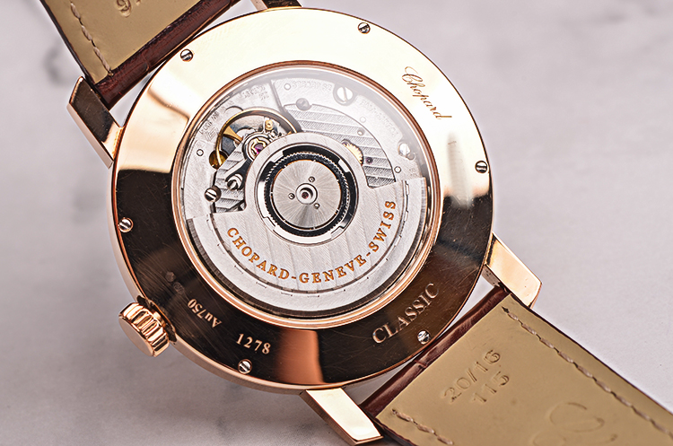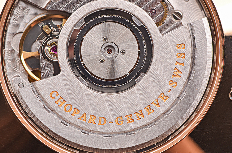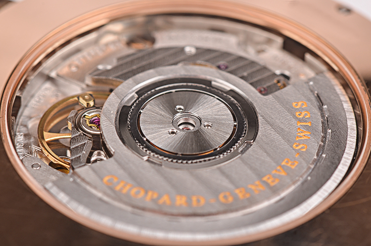 萧邦自动机械机芯,精致日内瓦条纹打磨,倒角抛光修饰。25钻,摆频28800,动力储存约42小时,走时状态极嘉。