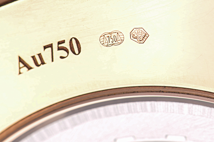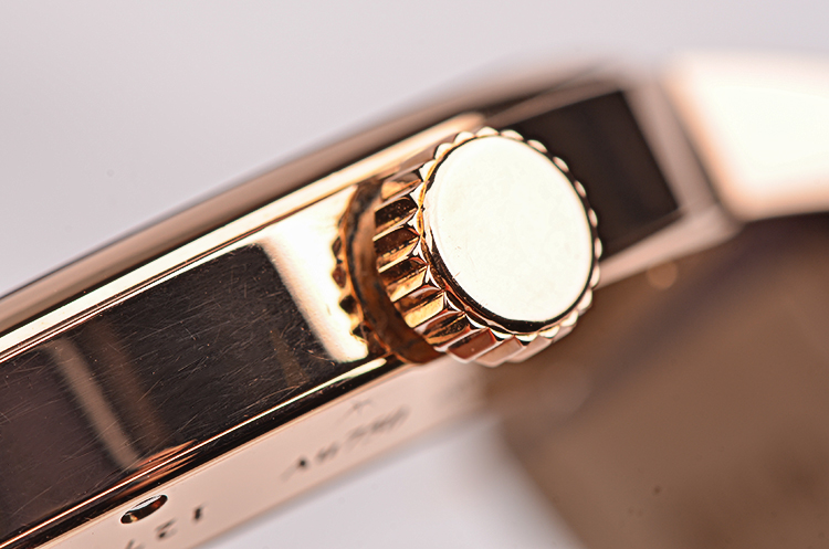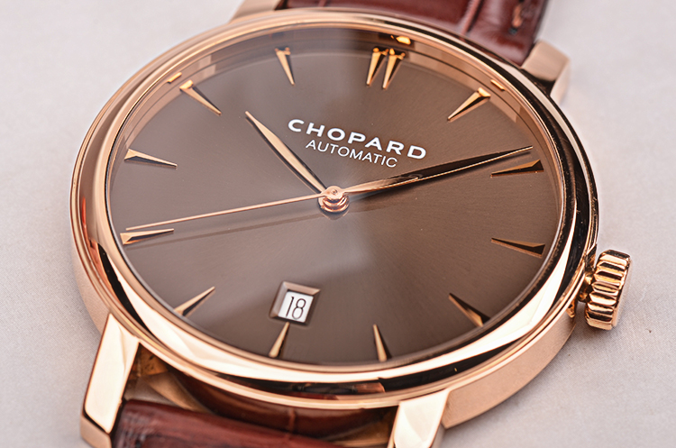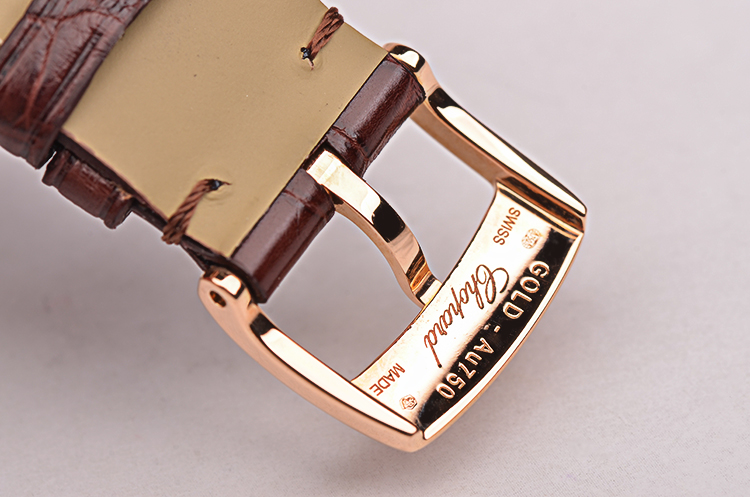 18K玫瑰金表壳及表扣,圣伯纳狗头印记。后配全新棕色鳄鱼皮表带。蓝宝石水晶镜面及底盖,立体棕色表盘,玫瑰金刻度及指针,6点位日历显示功能。口径40MM*8MM。防水30M。