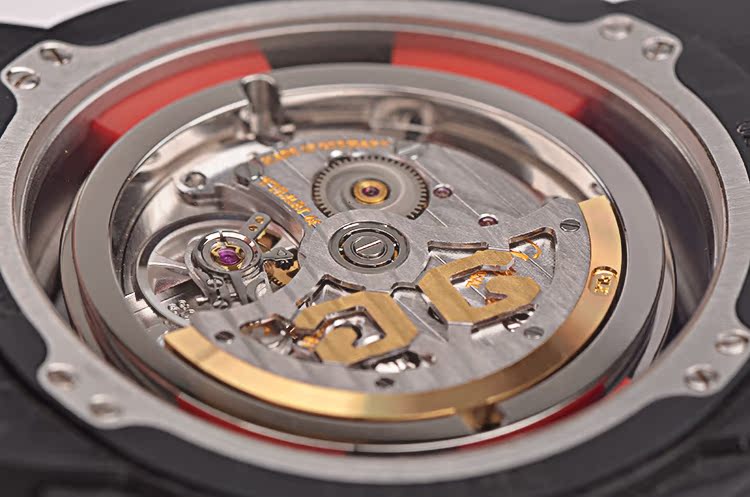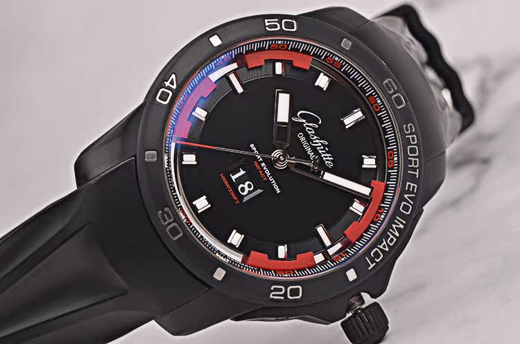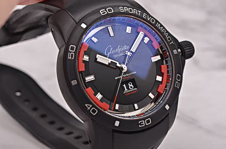 精钢表壳覆黑色橡胶包层,据官方实验至少可抵御60%外力冲击对运动表机芯震荡产生的影响。精钢表扣,原厂黑色橡胶表带成色很新。抗反光涂层蓝宝石水晶镜面及底盖,橡胶涂层计时表圈,立体黑色外圈镂空表盘,2、4、8、10四位置红色加固装置,用于加固表盘与机芯。夜光刻度及时分针,6点位大日历视窗。裹覆橡胶涂层的旋入式防水表冠。口径46MM*13.4MM,防水100M。