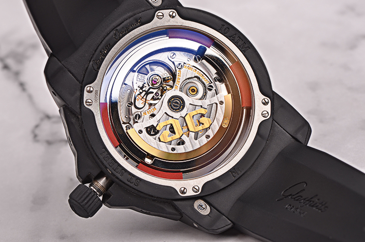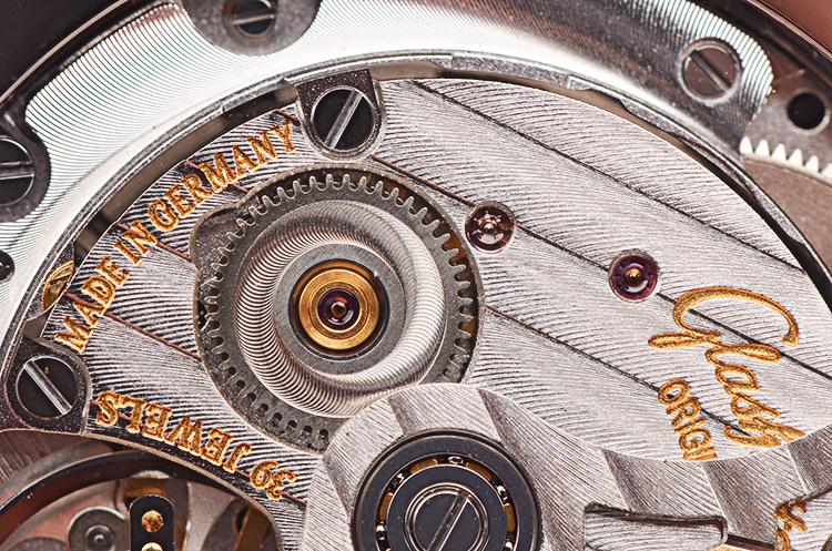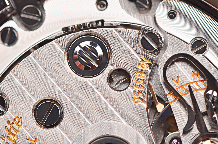 GO自产CAL.39-47型机芯,自动机械,极其精致人手条纹打磨,倒角抛光修饰。标准德式3/4大夹板机芯,21K黄金镂空自动转陀,鹅颈微调,39钻,摆频28800,动力储存约40小时,走时状态极嘉。